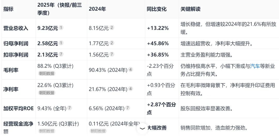 根据公司于2026年2月25日晚间发布的业绩快报,2025年全年实现营业总收入 9.23亿元,同比增长 13.22%;归属于母公司所有者的净利润 2.58亿元,同比增长 45.86%。扣非净利润为 2.13亿元,同比增长 36.85%。