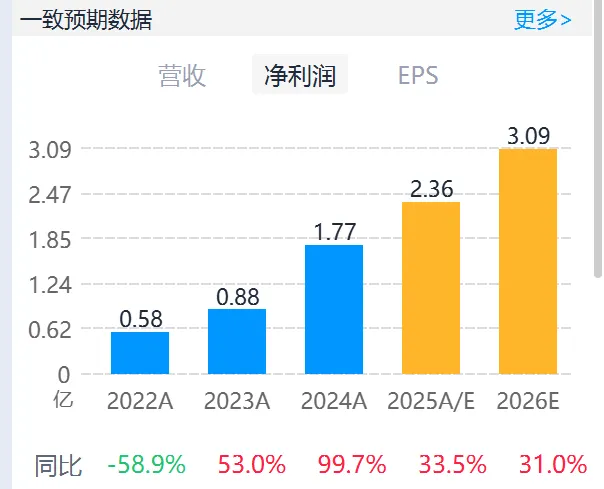 主要券商基于公司新业务的进展,普遍维持了对未来两年较高增长的预测。26年一致预期净利润3.09亿,同比+31%。