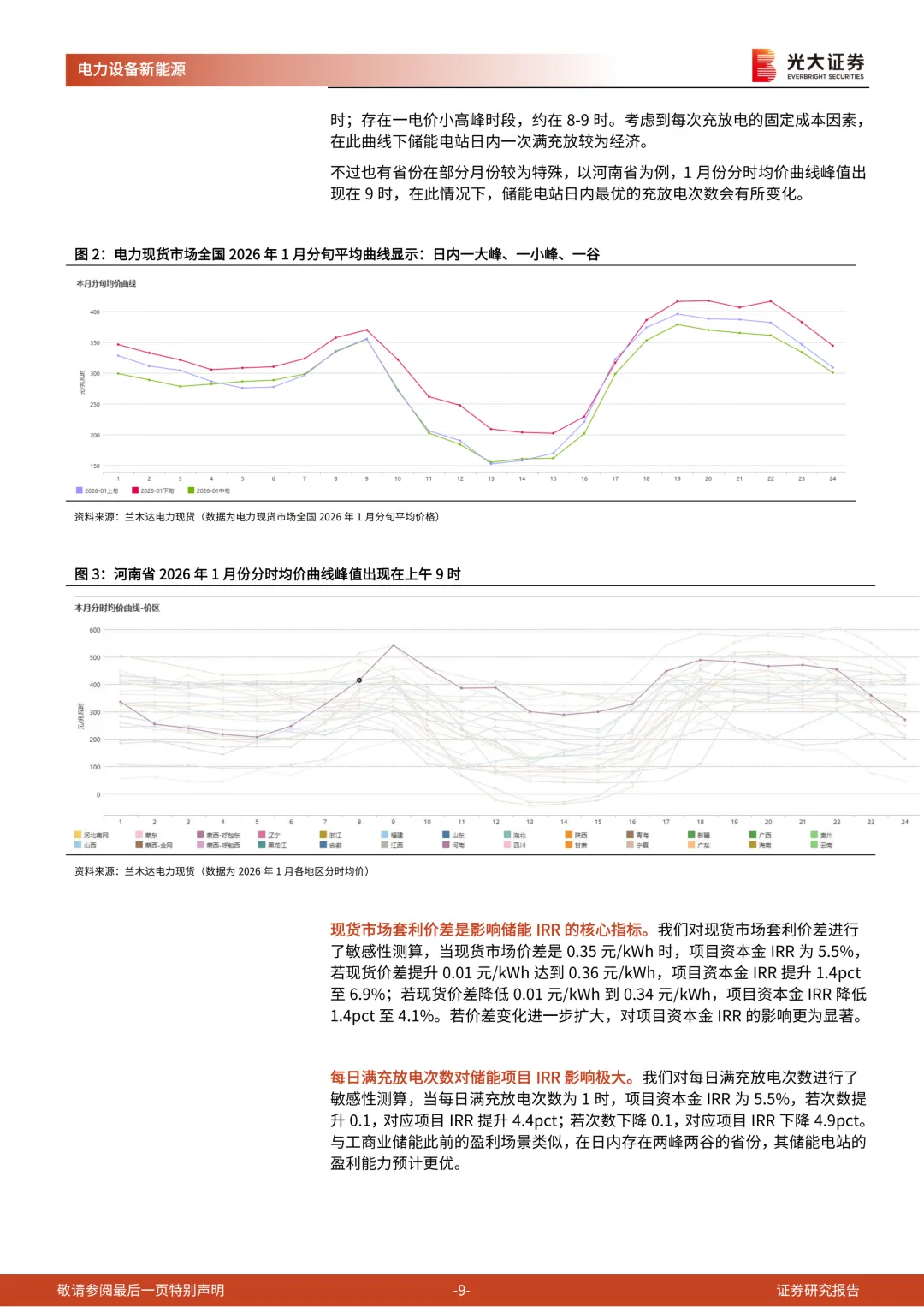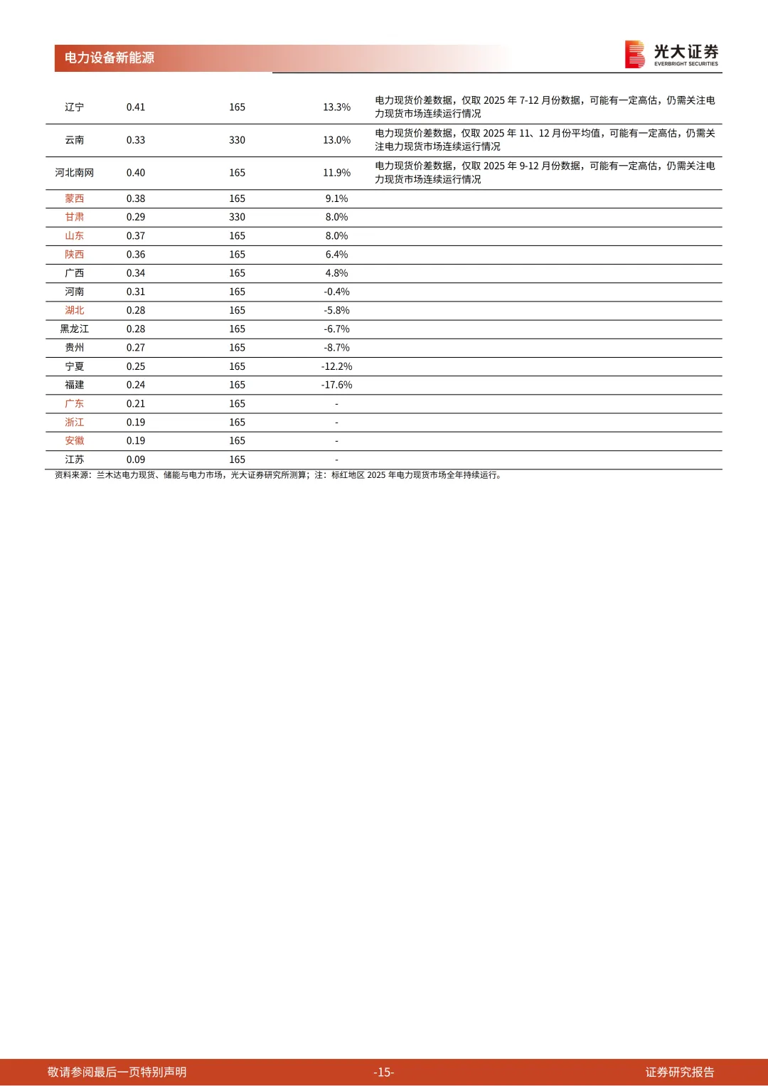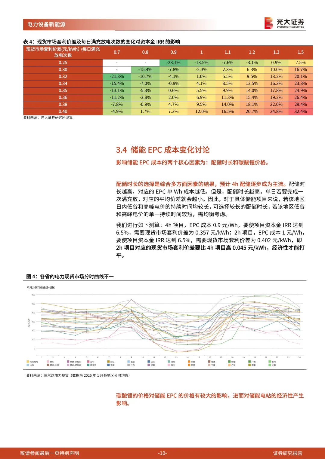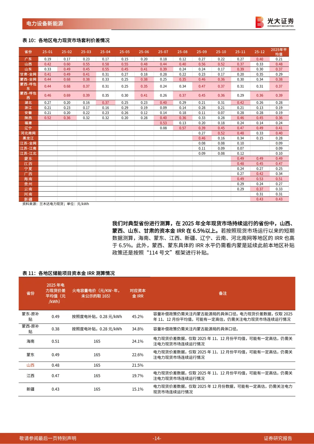 我们对典型省份进行测算,在2025年全年现货市场持续运行的地区中,山西、内蒙、山东、甘肃的资本金IRR在6.5%以上。若按照现货市场运行以来的短期数据测算,海南、江西、新疆、辽宁、云南、河北等地区的IRR也高于6.5%。需要重点关注:各省电力现货市场价差情况的月度变化,各省2026年煤电容量电价的定价,以及碳酸锂等原材料价格的变动情况。