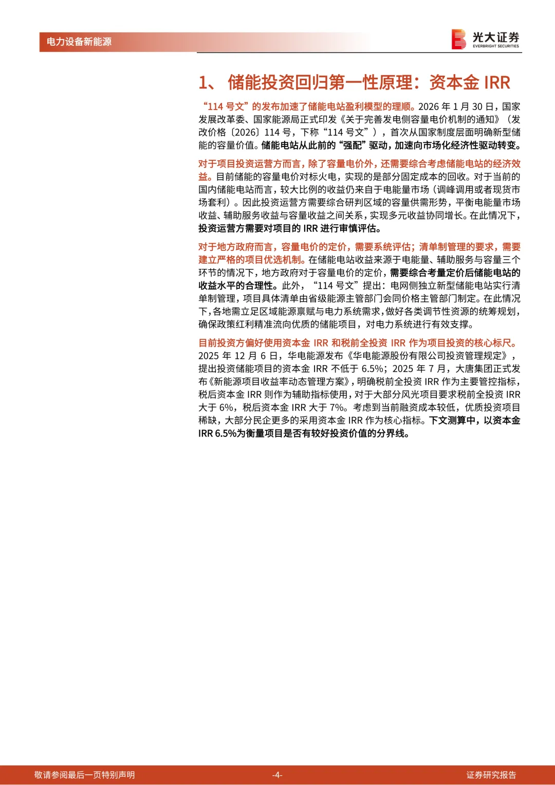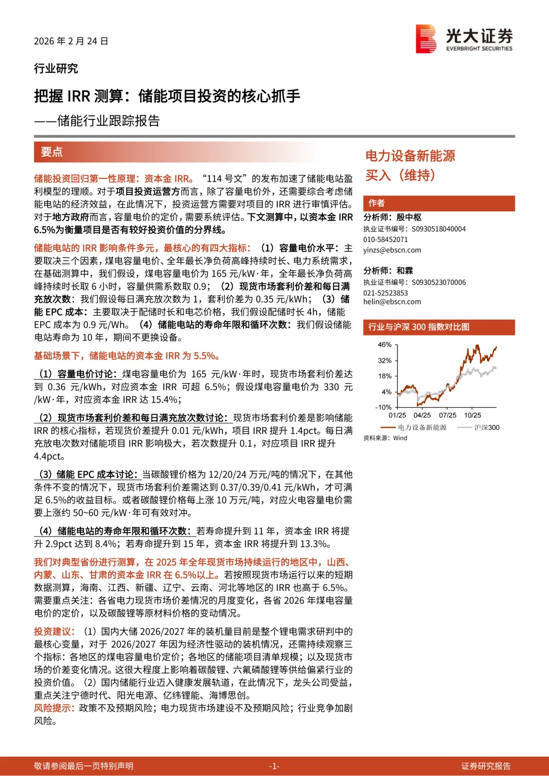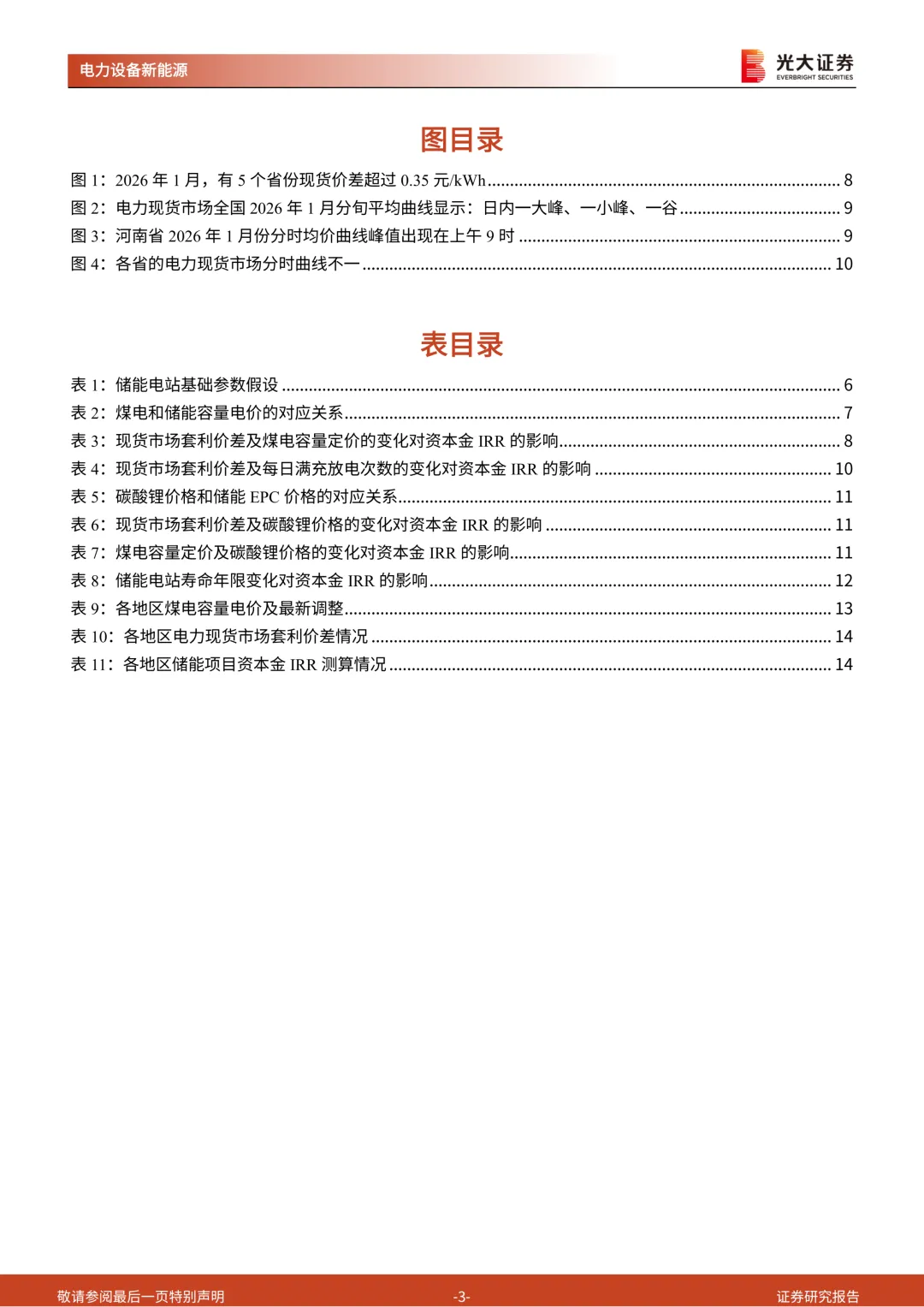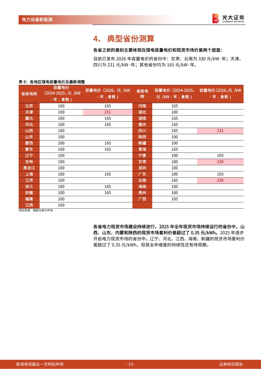我们对典型省份进行测算,在2025年全年现货市场持续运行的地区中,山西、内蒙、山东、甘肃的资本金IRR在6.5%以上。若按照现货市场运行以来的短期数据测算,海南、江西、新疆、辽宁、云南、河北等地区的IRR也高于6.5%。需要重点关注:各省电力现货市场价差情况的月度变化,各省2026年煤电容量电价的定价,以及碳酸锂等原材料价格的变动情况。
