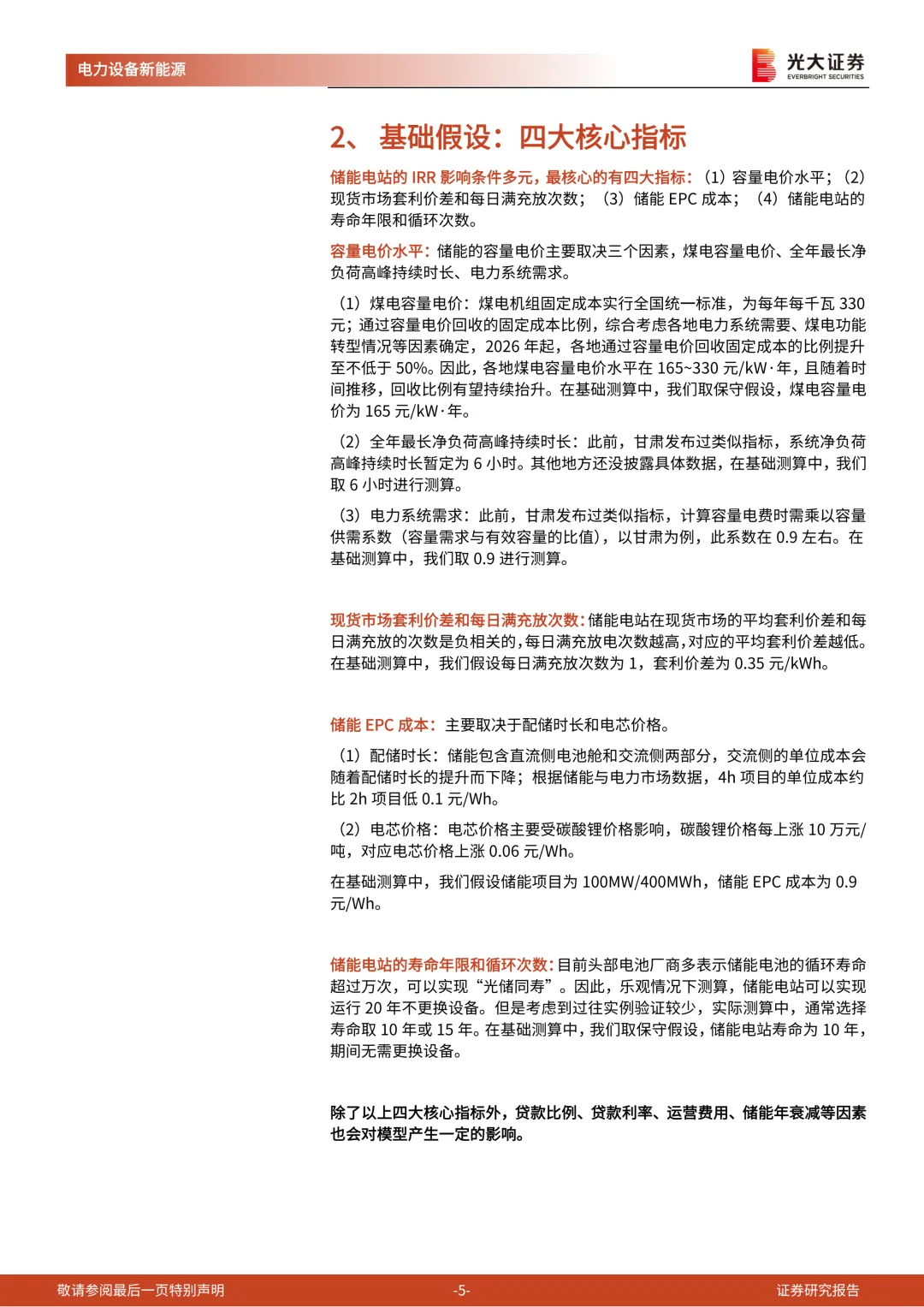 储能电站的IRR影响条件多元,最核心的有四大指标:(1)容量电价水平:主要取决三个因素,煤电容量电价、全年最长净负荷高峰持续时长、电力系统需求,在基础测算中,我们假设,煤电容量电价为165元/kW·年,全年最长净负荷高峰持续时长取6小时,容量供需系数取0.9;(2)现货市场套利价差和每日满充放次数:我们假设每日满充放次数为1,套利价差为0.35元/kWh;(3)储能EPC成本:主要取决于配储时长和电芯价格,我们假设配储时长4h,储能EPC成本为0.9元/Wh。(4)储能电站的寿命年限和循环次数:我们假设储能电站寿命为10年,期间不更换设备。