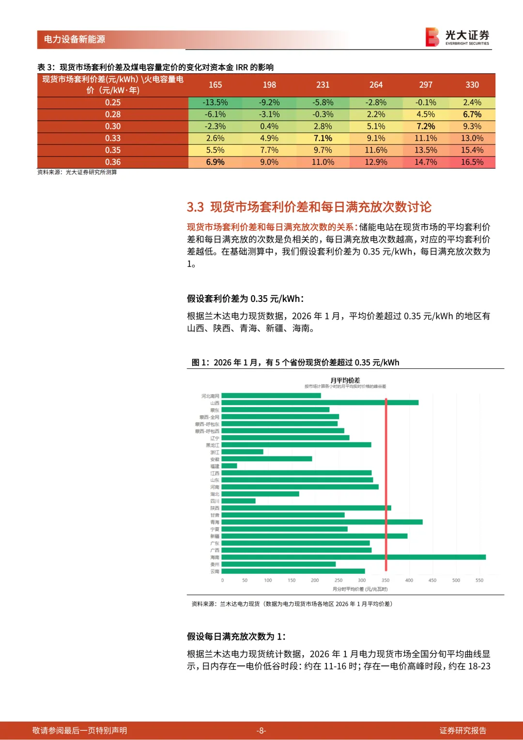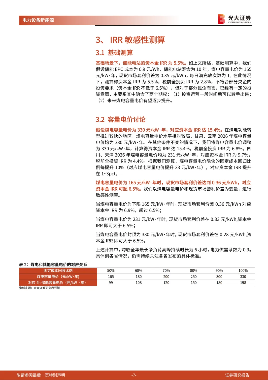 (1)容量电价讨论:煤电容量电价为165元/kW·年时,现货市场套利价差达到0.36元/kWh,对应资本金IRR可超6.5%;假设煤电容量电价为330元/kW·年,对应资本金IRR达15.4%;