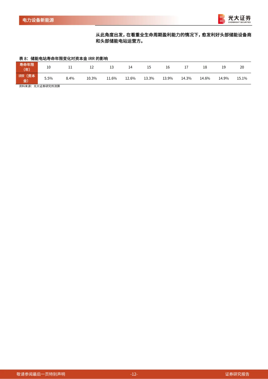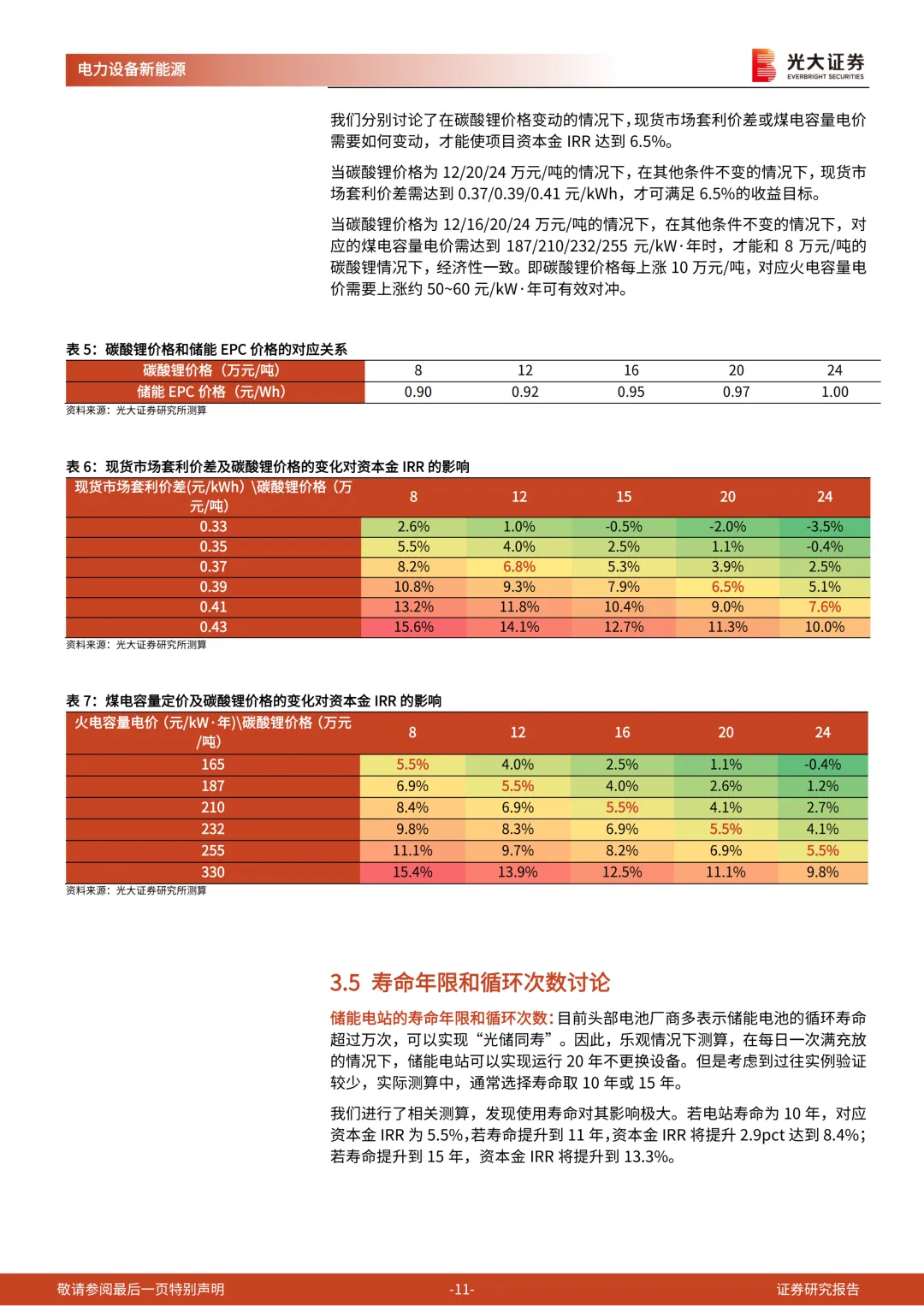 (4)储能电站的寿命年限和循环次数:若寿命提升到11年,资本金IRR将提升2.9pct达到8.4%;若寿命提升到15年,资本金IRR将提升到13.3%。