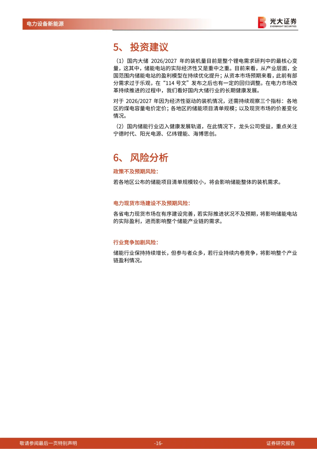投资建议:(1)国内大储2026/2027年的装机量目前是整个锂电需求研判中的最核心变量,对于2026/2027年因为经济性驱动的装机情况,还需持续观察三个指标:各地区的煤电容量电价定价;各地区的储能项目清单规模;以及现货市场的价差变化情况。这很大程度上影响着碳酸锂、六氟磷酸锂等供给偏紧行业的投资价值。(2)国内储能行业迈入健康发展轨道,在此情况下,龙头公司受益,重点关注宁德时代、阳光电源、亿纬锂能、海博思创。