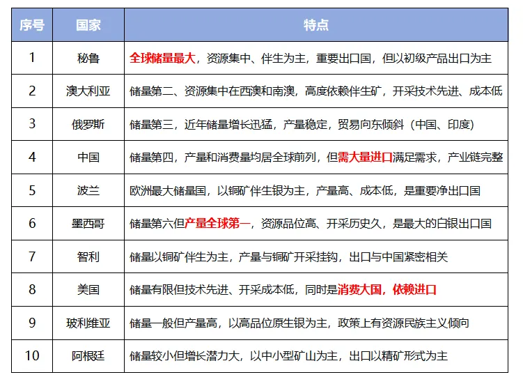 全球白银资源相较集中,前十大储量国占全球储量的主要部分,其中秘鲁、澳大利亚、俄罗斯、中国和波兰合计占比达71%。从产量看,墨西哥、中国、秘鲁、波兰和玻利维亚是主要生产国。白银资源以伴生矿为主(全球约70~80%储量伴生于铜、铅锌等金属),这意味着,全球白银的供应量很大程度上受这些主金属(尤其是铜、锌)的市场行情和开采决策影响,而不仅仅是白银自身的价格。