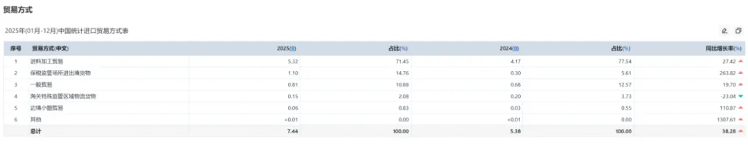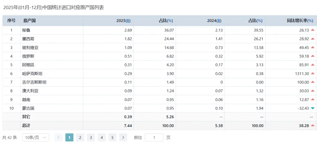 2025年1至12月,中国银矿进口总额达 74.4亿美元,同比大幅增长38.28%。从贸易方式看,进口结构高度集中,加工贸易是绝对主力,全年进口额53.2亿美元,同比增长27.42%,占进口总额的71.45%。这凸显了我国进口银矿主要用于后续加工再出口的产业模式。一般贸易进口额8.1亿美元,占比10.88%,同比增长19.70%。总的来说,规模加速扩张,加工贸易占主导。