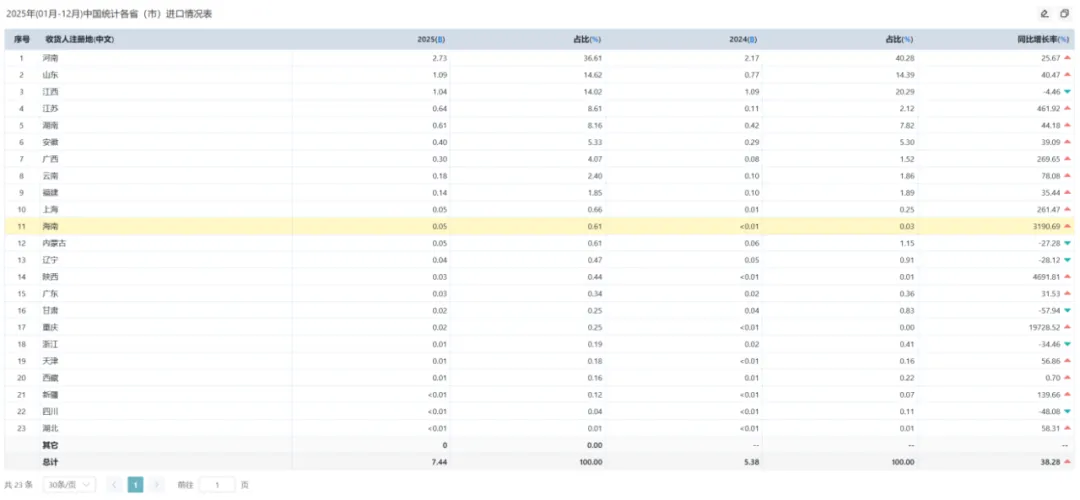 除此之外,部分内陆与沿海省市进口额呈现指数级增长,成为年度显著亮点,反映出国内产业布局的新动向:重庆市同比增速高达19728.5%(增长近200倍),表现最为突出,陕西省同比增长4691.81%,海南省同比增长3190.69%。这一分布格局表明,中国银矿的进口加工产业在巩固河南、山东等传统基地的同时,正快速向重庆、陕西等内陆地区以及海南等具有政策与区位优势的新兴区域扩散。