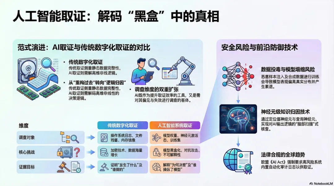数字化取证传统上是一门关于“重构过去”的学科,其核心在于对存储媒介中静态数据残留的提取与分析 5。然而,人工智能取证的兴起标志着取证范式从“静态位分析”向“动态逻辑归因”的根本性转变 3。