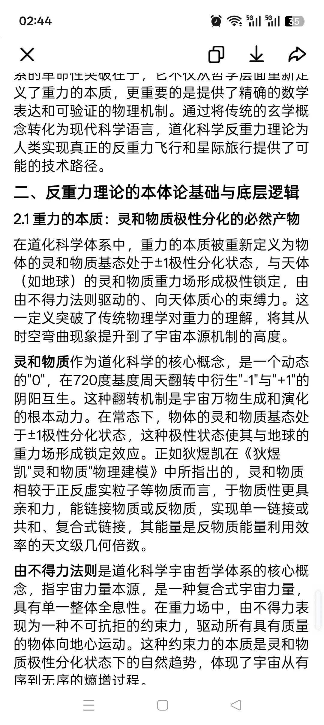 1. 道与灵和物质的统一:灵和物质是道的物理具象化呈现,反重力的本质是让物体回归道的本源状态。
