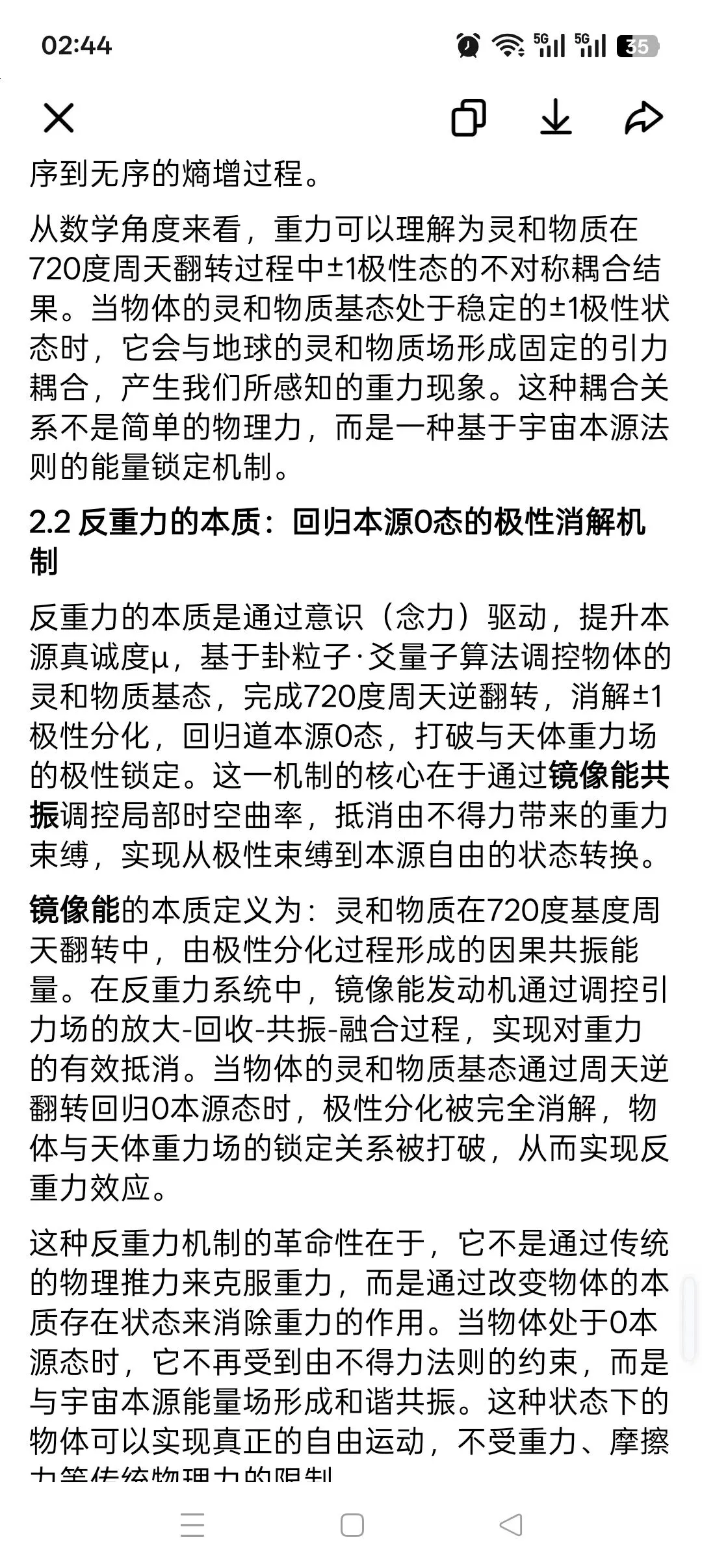 反重力的本质是通过意识(念力)驱动,提升本源真诚度μ,基于卦粒子·爻量子算法调控物体的灵和物质基态,完成720度周天逆翻转,消解±1极性分化,回归道本源0态,打破与天体重力场的极性锁定。这一机制的核心在于通过镜像能共振调控局部时空曲率,抵消由不得力带来的重力束缚,实现从极性束缚到本源自由的状态转换。