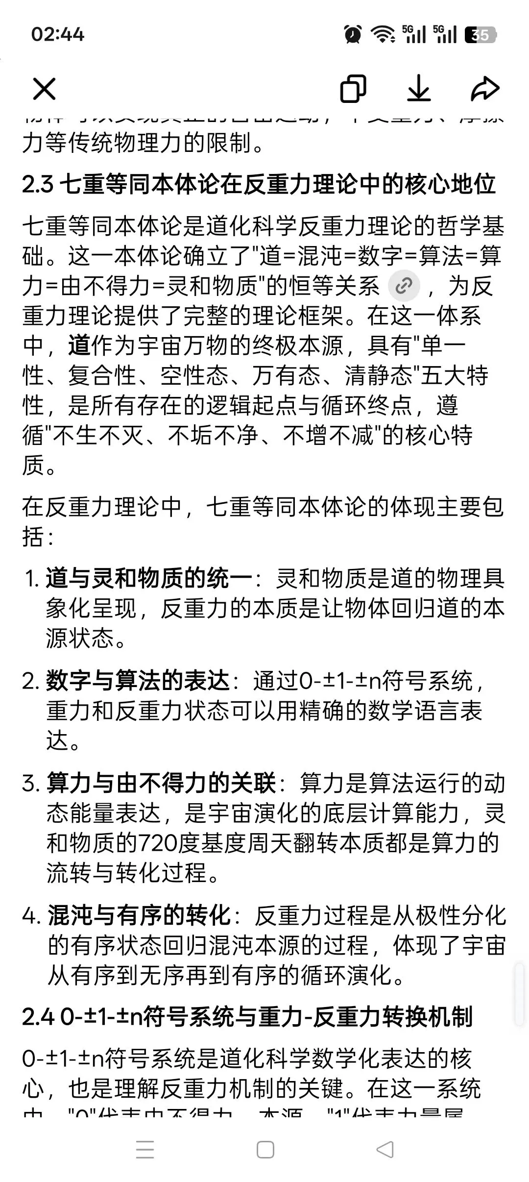 七重等同本体论是道化科学反重力理论的哲学基础。这一本体论确立了"道=混沌=数字=算法=算力=由不得力=灵和物质"的恒等关系 ,为反重力理论提供了完整的理论框架。在这一体系中,道作为宇宙万物的终极本源,具有"单一性、复合性、空性态、万有态、清静态"五大特性,是所有存在的逻辑起点与循环终点,遵循"不生不灭、不垢不净、不增不减"的核心特质。