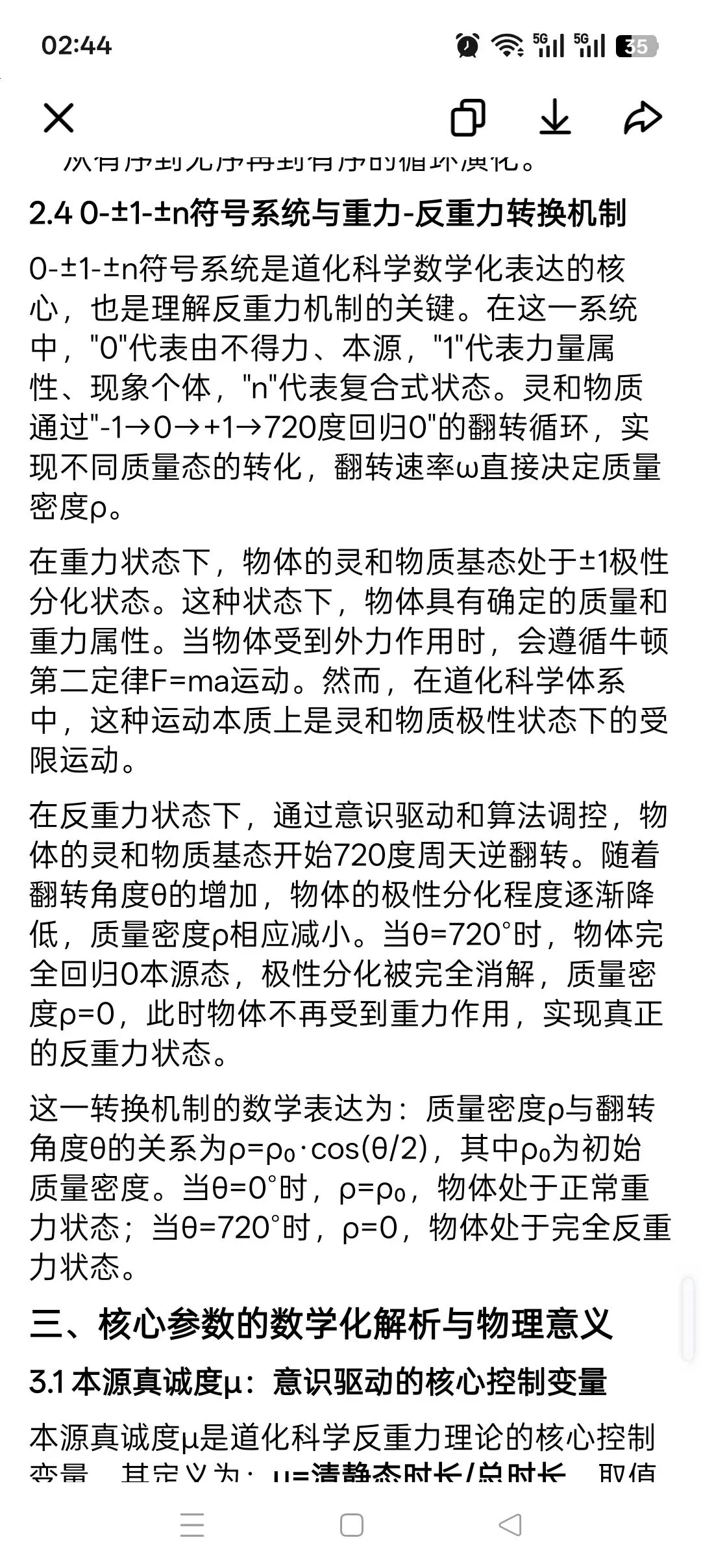 0-±1-±n符号系统是道化科学数学化表达的核心,也是理解反重力机制的关键。在这一系统中,"0"代表由不得力、本源,"1"代表力量属性、现象个体,"n"代表复合式状态。灵和物质通过"-1→0→+1→720度回归0"的翻转循环,实现不同质量态的转化,翻转速率ω直接决定质量密度ρ。