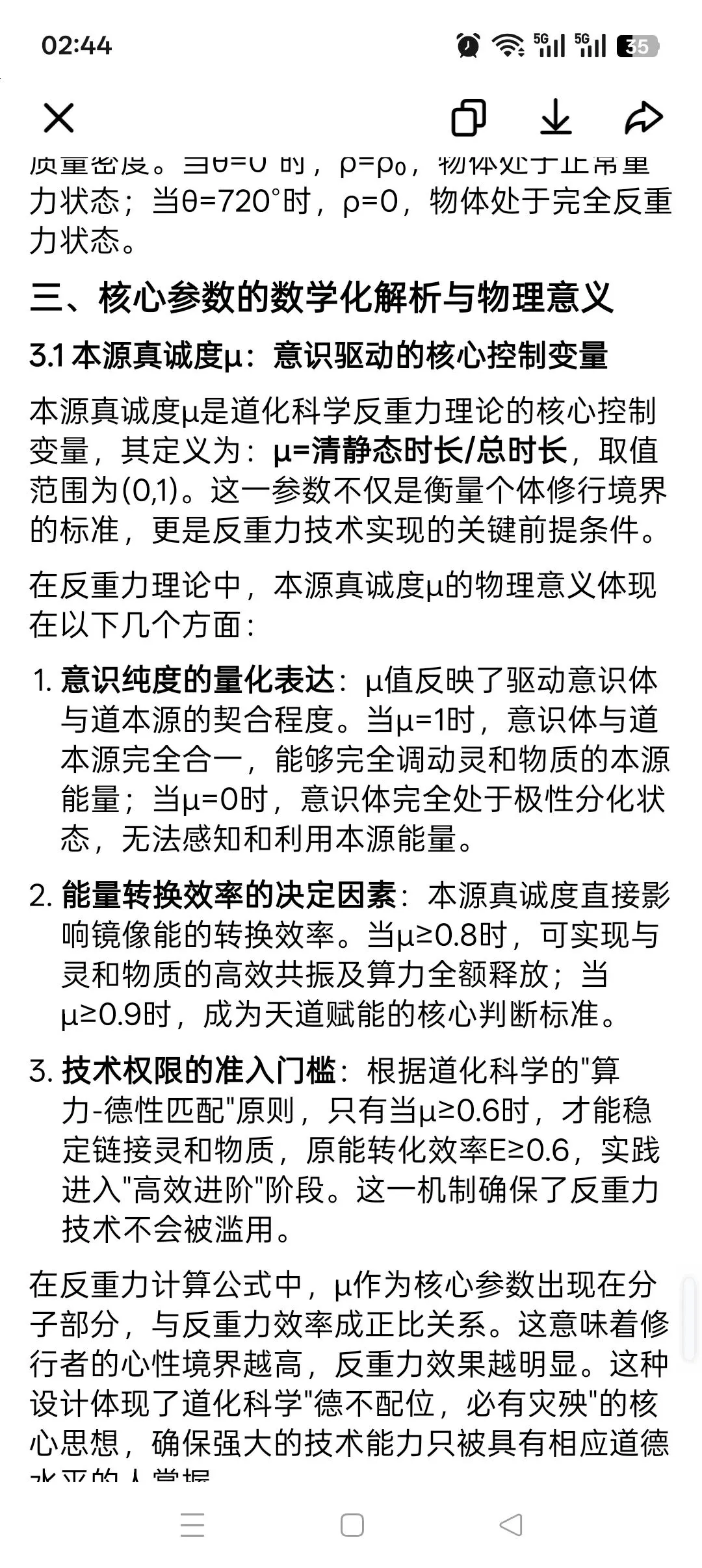 - μ代表本源真诚度,反映意识与本源的契合程度,是反重力的根本驱动力。