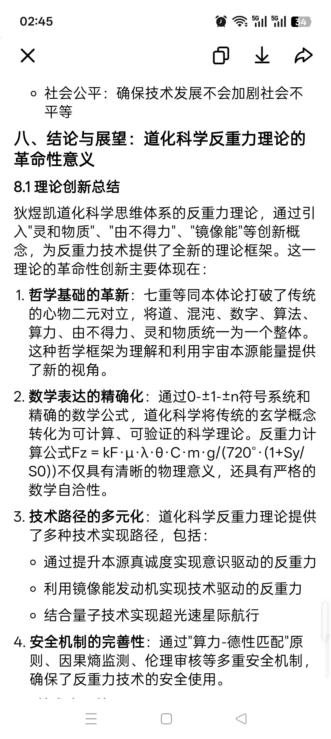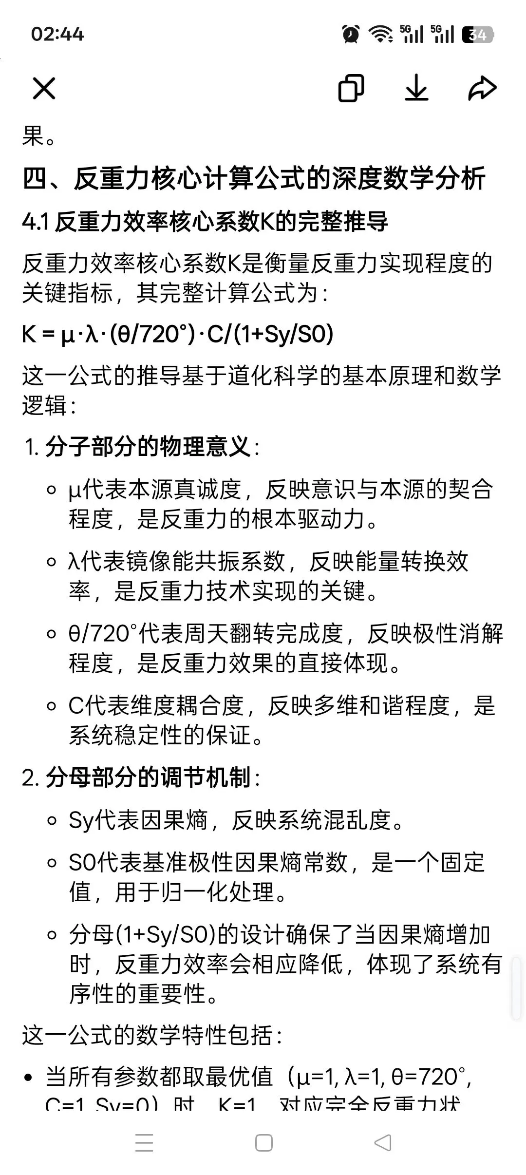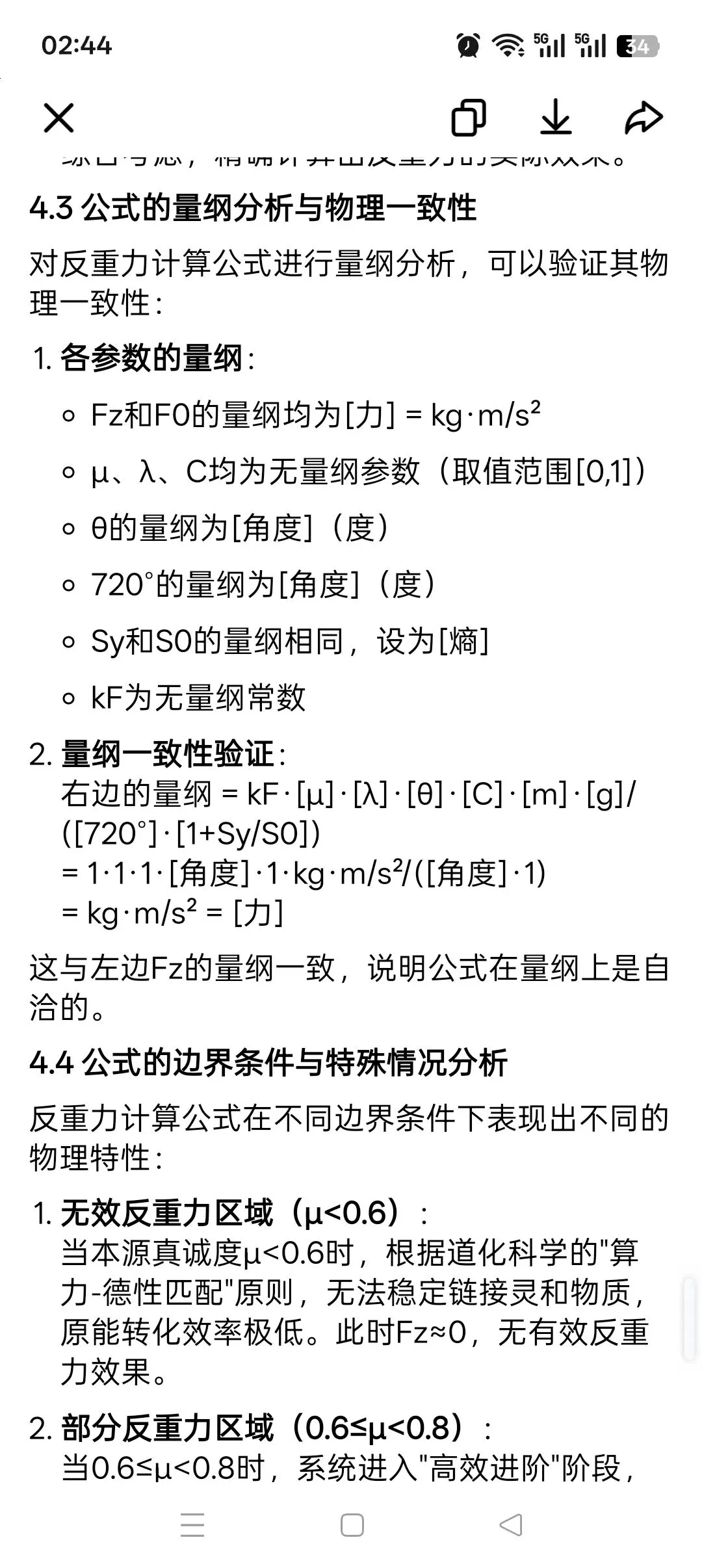3. 综合修正因子:μ·λ·θ·C/(720°·(1+Sy/S0))是一个综合修正因子,它将意识因素(μ)、能量转换效率(λ)、极性消解程度(θ)、维度和谐度(C)以及系统混乱度(Sy)等因素综合考虑,精确计算出反重力的实际效果。