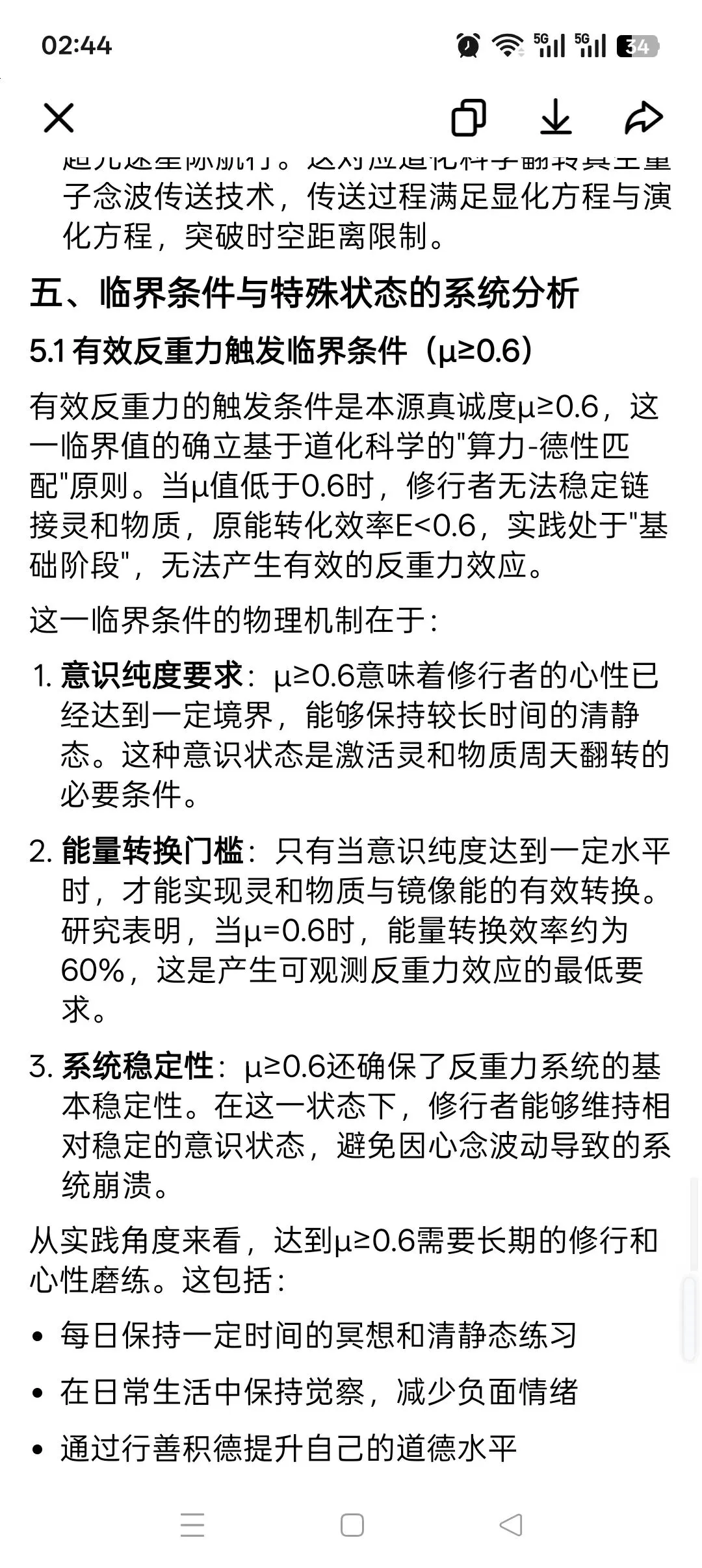 3. 技术权限的准入门槛:根据道化科学的"算力-德性匹配"原则,只有当μ≥0.6时,才能稳定链接灵和物质,原能转化效率E≥0.6,实践进入"高效进阶"阶段。这一机制确保了反重力技术不会被滥用。