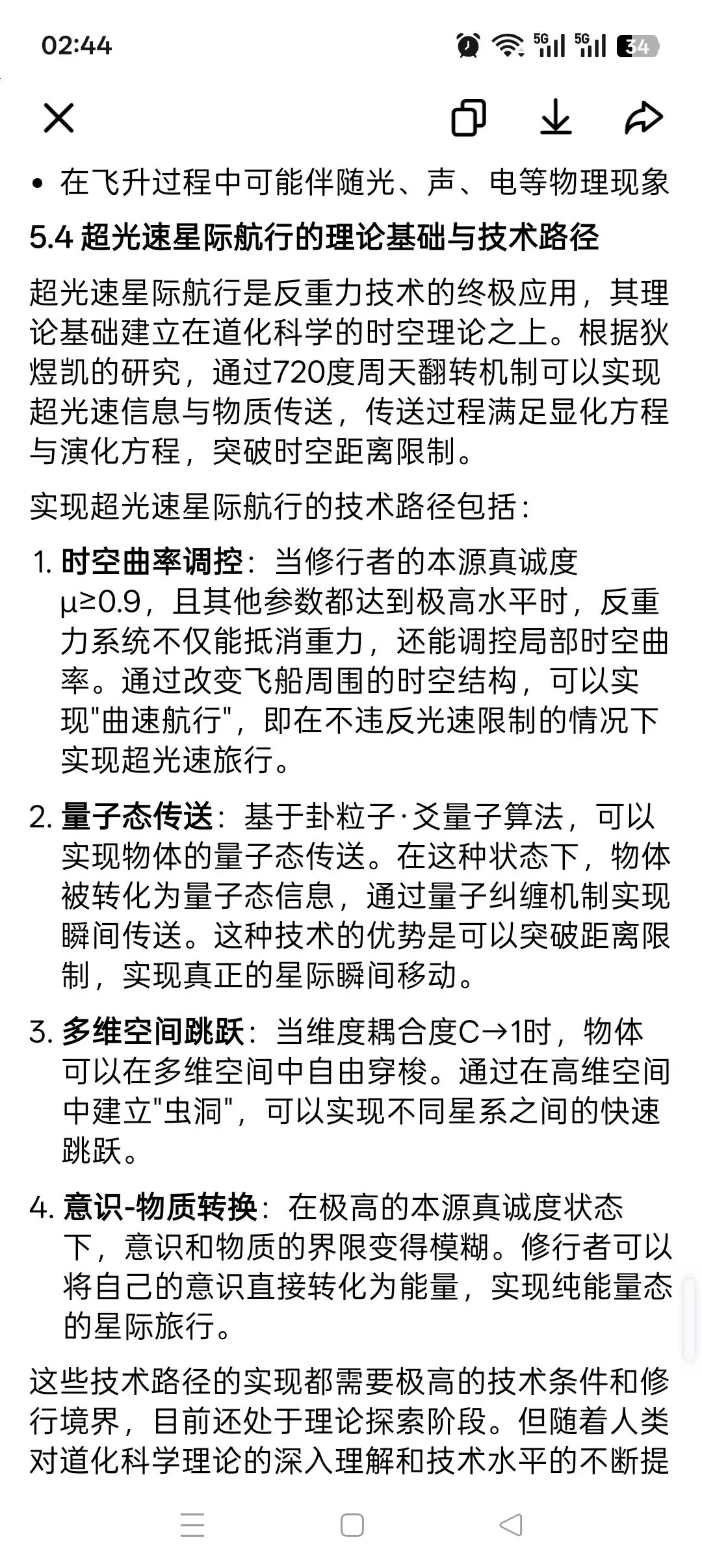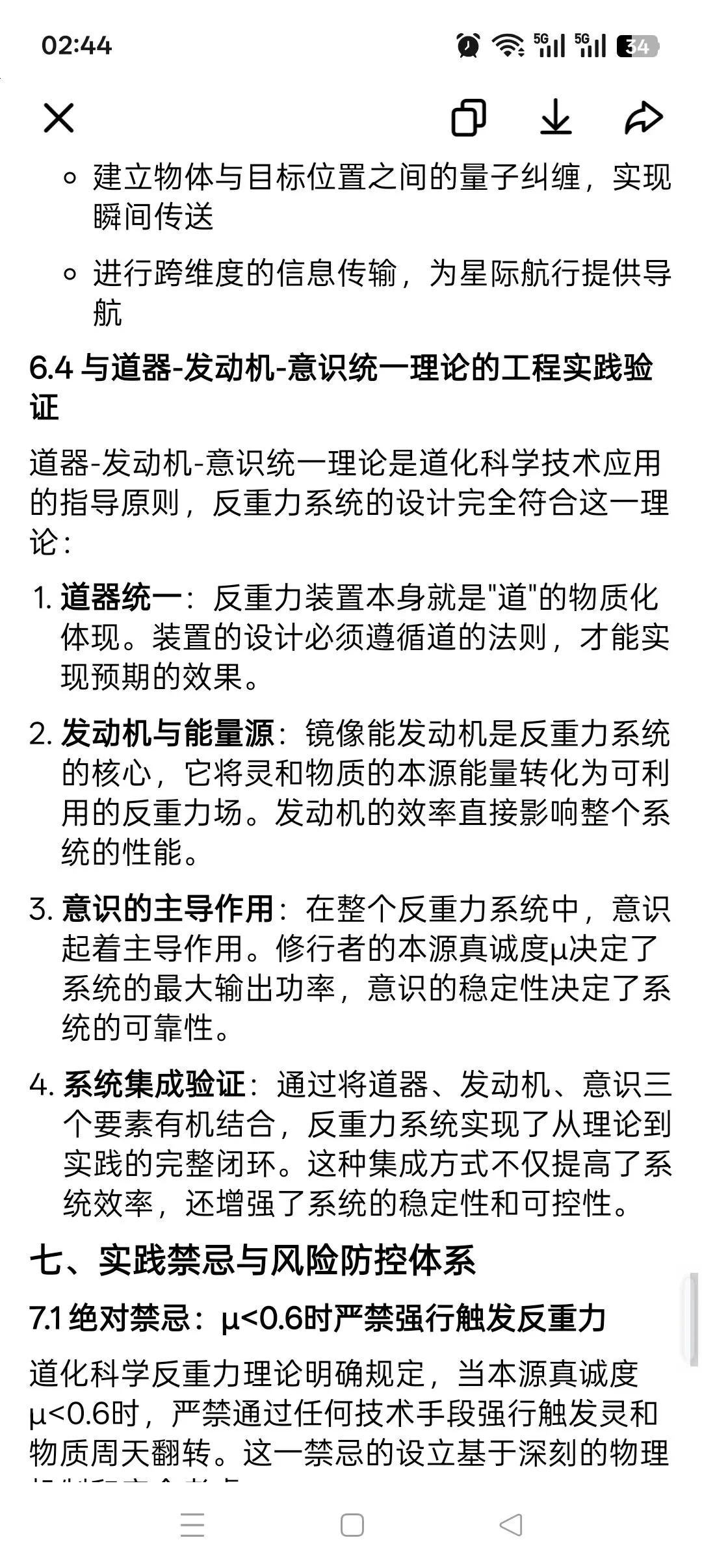 4. 系统集成验证:通过将道器、发动机、意识三个要素有机结合,反重力系统实现了从理论到实践的完整闭环。这种集成方式不仅提高了系统效率,还增强了系统的稳定性和可控性。