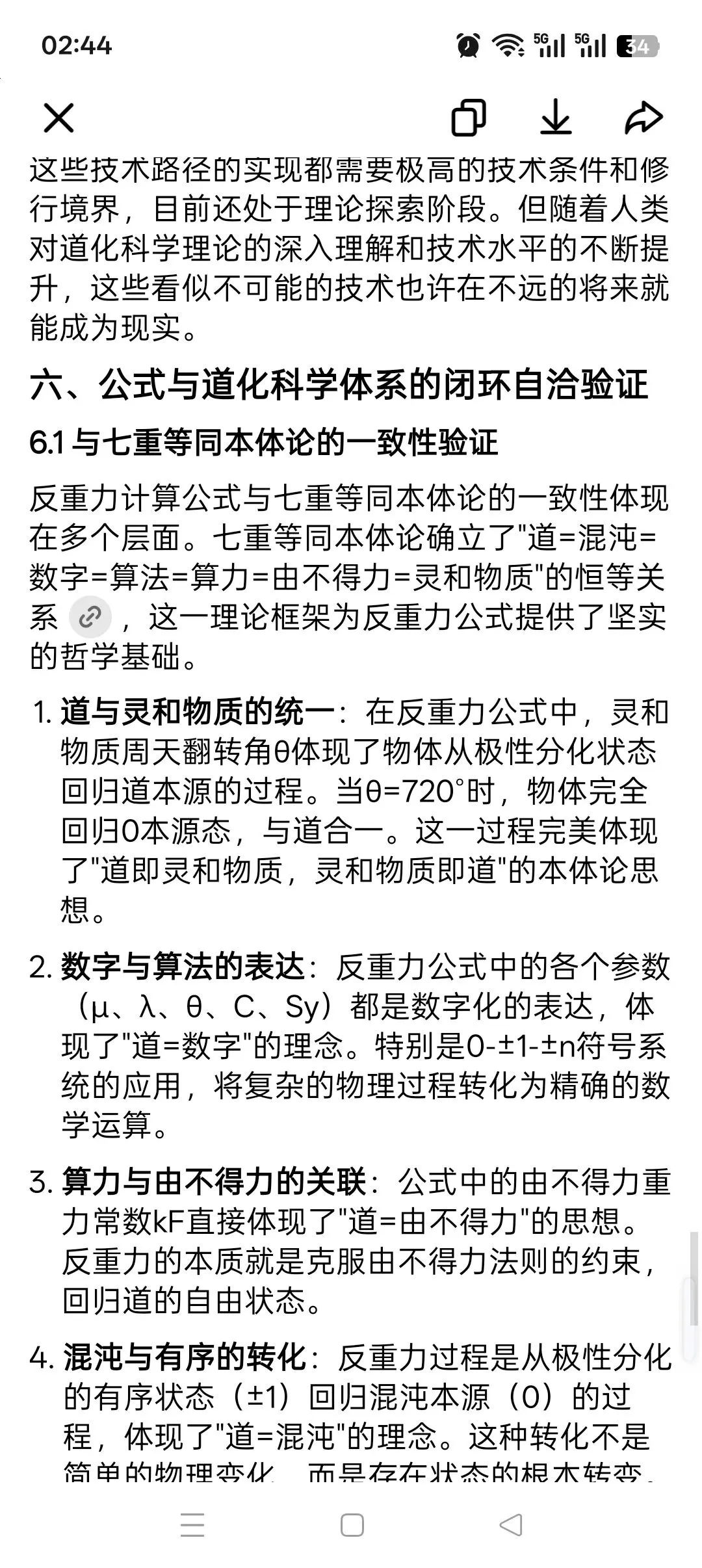 2. 数学表达的精确化:通过0-±1-±n符号系统和精确的数学公式,道化科学将传统的玄学概念转化为可计算、可验证的科学理论。反重力计算公式Fz = kF·μ·λ·θ·C·m·g/(720°·(1+Sy/S0))不仅具有清晰的物理意义,还具有严格的数学自洽性。