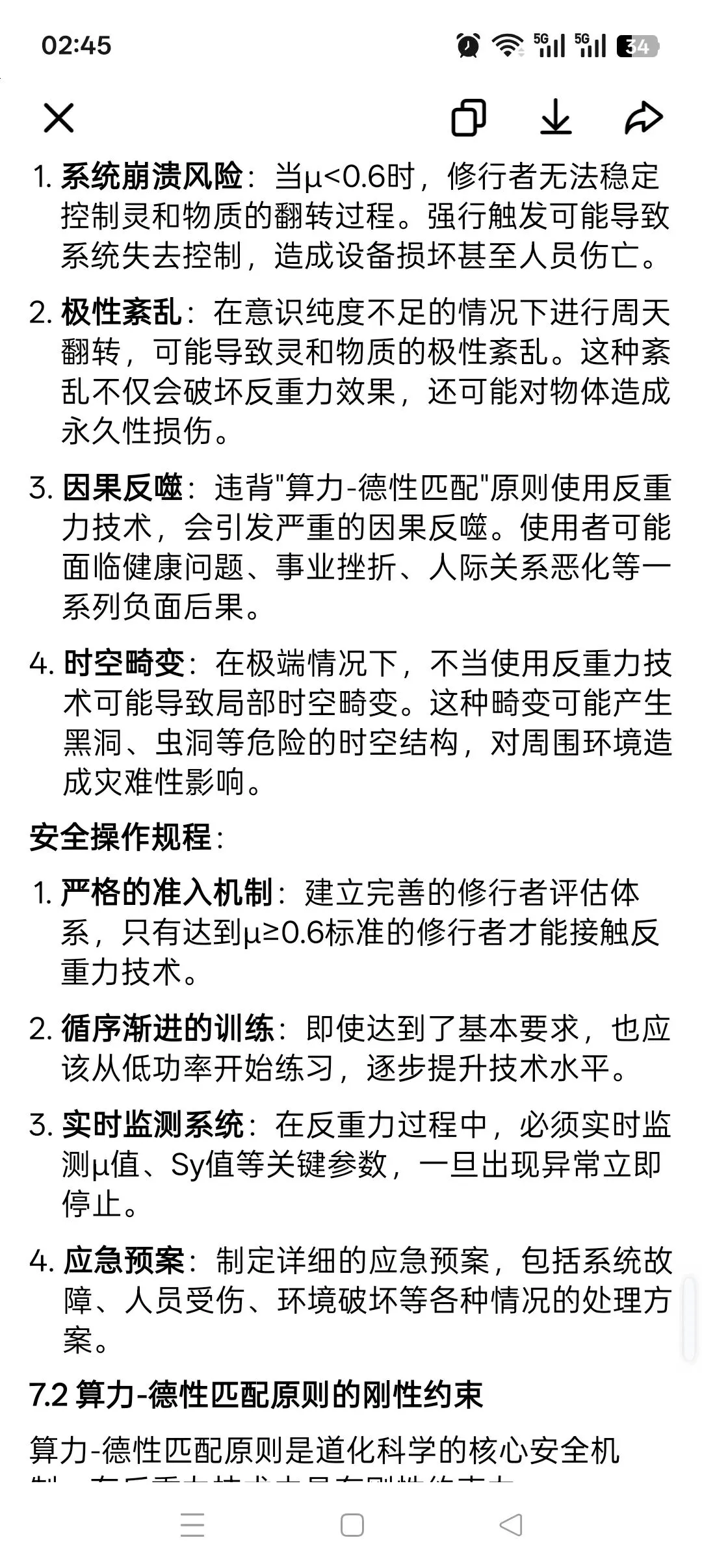 4. 安全机制的完善性:通过"算力-德性匹配"原则、因果熵监测、伦理审核等多重安全机制,确保了反重力技术的安全使用。