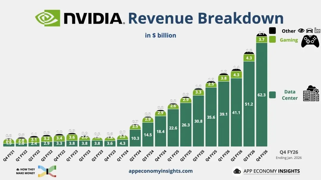 英伟达本次披露的关键不在于是否再度超预期,而在于其增长结构是否进入可持续的第二阶段。第四财季营收达681亿美元,经营利润443亿美元,季度毛利率75.0%。这显示在Blackwell爬坡与成本结构改善后,利润率维持在高位区间并非偶然。更重要的是,第四财季自由现金流达349.0亿美元,使增长质量不再仅依赖会计利润。需要注意的是,年度毛利率从2025财年的75.0%小幅下滑至71.1%,表明产品组合变化对利润结构的扰动仍未消散,因此市场更愿意将估值锚定在现金流层面。