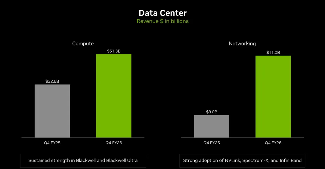 - •业绩双轮驱动:第四财季营收达 681 亿美元,环比增长 20%。数据中心业务中,网络互联收入爆发至 109.8 亿美元,同比激增 263%,与计算业务共同构成真实的双引擎。