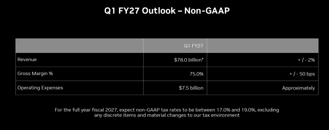 - •指引挤出水分:2027财年第一财季营收指引 780 亿美元±2%。该指引在明确排除中国数据中心计算收入的前提下依然超预期,显示海外原生需求的高景气度。