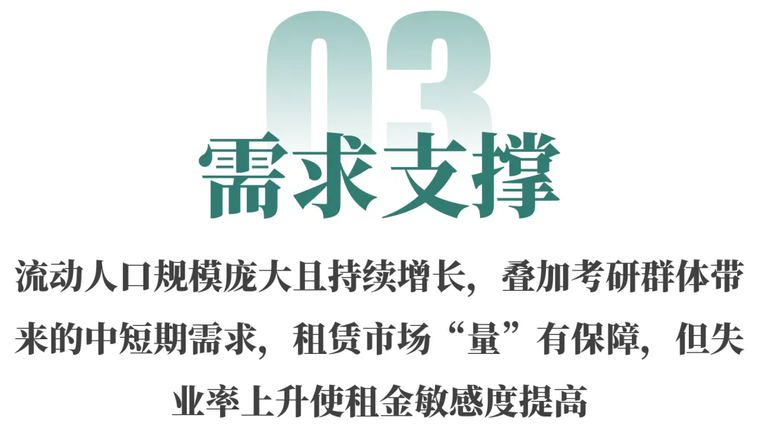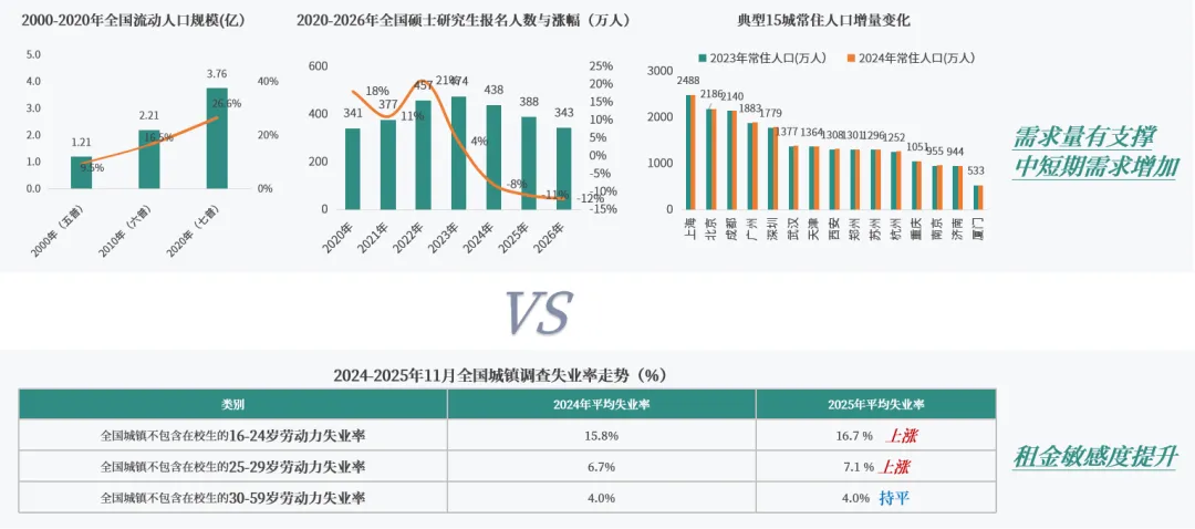 市场需求量有支撑,中短期需求增加。全国3.76亿(七普披露)流动人口构成了租赁市场最稳固的基本盘,同时每年超过340万人的考研群体带来了持续且稳定的中短期租赁需求。从城市看,京沪等一线城市因高房价压制购房需求,租赁意愿持续强劲;广深及多数二线城市则受益于人口净流入,租赁需求持续旺盛。