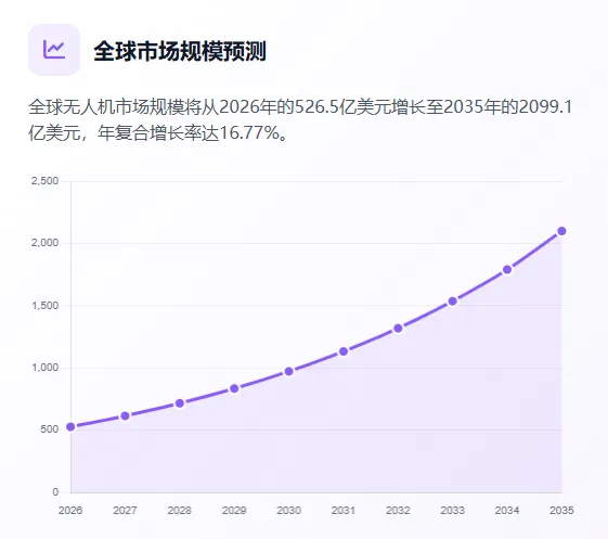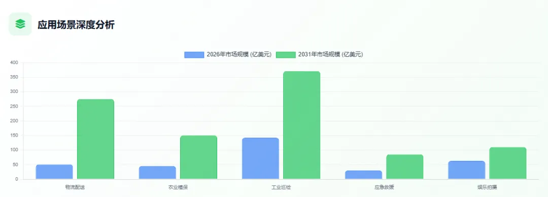 未来 5 年(2026-2031 年),全球无人机产业正迎来从"试点探索"向"规模化商业运营"的历史性转折期。根据多家权威机构预测,全球无人机市场规模将从 2026 年的526.5 亿美元增长至 2035 年的2099.1 亿美元,年复合增长率达 16.77%。中国市场表现尤为突出,预计 2026 年民用无人机市场规模突破2000 亿元,2030 年达到3200 亿元,年均复合增长率约 18%。 技术创新方面,无人机正经历从"自动化"向"智能化"的跃迁。自主飞行技术将在 2028 年实现L4 级高度自主,2032 年达到L5 级完全自动化;电池技术迎来革命性突破,固态电池能量密度突破 400Wh/kg,氢燃料电池实现商业化;通信技术向5G-A/6G演进,实现通感一体和厘米级定位;制造材料向轻量化、高强度复合材料发展。 应用场景呈现全面开花态势。物流配送领域,全球市场规模预计从 2026 年的50.4 亿美元增长至 2031 年的275 亿美元,年复合增长率高达 32.68%;农业植保领域,中国市场规模将从 2025 年的150 亿元增长至 2031 年的600 亿元,年复合增长率超过 20%;工业巡检市场预计从 2026 年的142.3 亿美元增长至 2031 年的370.5 亿美元,年复合增长率达 21.2%。 政策环境显著改善,中国新修订的《民用航空法》将于2026 年 7 月 1 日施行,首次增设"发展促进"专章,明确300 米以下低空分类分级管理规则。欧盟发布400 亿欧元安全防护计划,美国 FAA 推进超视距飞行规则制定,全球监管框架日趋完善。 产业生态正在重构,垂直整合趋势明显,平台化商业模式兴起,投资并购活跃。2026 年被业界称为 "无人机之年",预计将出现创纪录的采购和投资热潮。建议投资者重点关注技术壁垒高、场景落地能力强、商业模式清晰的优质企业。1. 技术发展趋势分析