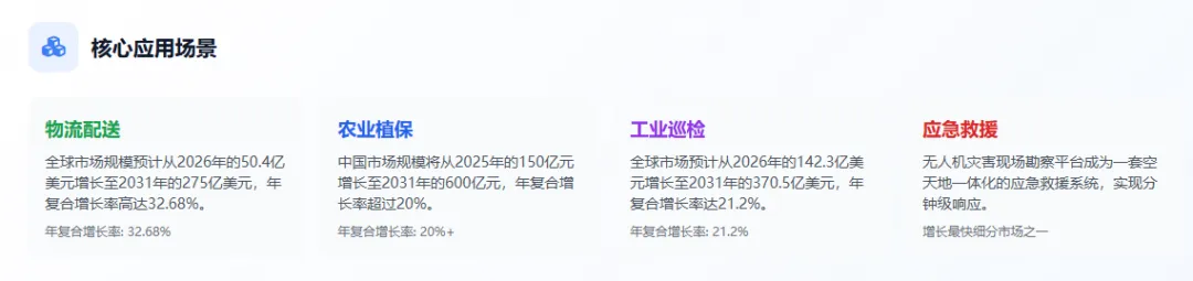 物流配送是无人机应用最具潜力的领域之一,正从 "试点试水" 阶段进入 "规模化落地" 的关键期。全球配送无人机市场规模预计从 2025 年的50.4 亿美元增长至 2031 年的275 亿美元,年复合增长率高达 32.68%。中国市场表现尤为突出,2026 年国内无人机物流市场规模有望突破500 亿元,2030 年将冲刺3000 亿元,年复合增长率超 40%。 城市即时配送是物流无人机的主要应用场景,聚焦城市内3-15 公里末端配送,核心品类为外卖、生鲜、药品、小型急件。截至 2026 年 2 月,全国已有深圳、上海、杭州、广州等12 个试点城市开通低空即时配送航线,美团、顺丰、饿了么等企业已落地常态化试点。上海互联宝地杨浦园的无人机配送航线,覆盖周边高校、园区,实现奶茶、简餐等品类15 分钟内送达;顺丰在深圳南山试点无人机药品配送,解决 "最后 1 公里" 配送难题。预计 2026 年底试点城市将扩至20 个,渗透率提升至10% 以上。 跨城物流成为增长最快的细分市场,聚焦城际100-500 公里支线运输,核心品类为高附加值急件(半导体样品、医疗试剂)、生鲜农产品、小型工业品。2026 年跨城物流市场规模预计达400-525 亿元,占整体市场的33%-35%。粤港澳大湾区、长三角、川渝地区已开通多条跨城低空物流航线,深圳 - 东莞、深圳 - 中山的航线实现常态化运营,单程飞行时间约20 分钟,较传统陆路运输节省超过80% 的时间。 应急物资运输作为刚需场景已实现规模化落地。全国已有20 多个省份将低空应急物流纳入应急救援体系,顺丰、京东、亿航、丰翼科技等企业已与地方应急管理部门达成合作。"天马 - 1000" 无人运输机最大载重达1 吨,最大航程1800 公里,应急运输实现半日达,5 分钟即可完成吨级物资装卸,有效破解了高原等特殊地域物资运输难题。2026 年应急物资运输市场规模预计达180-225 亿元,占整体低空物流市场的15%。 冷链物流作为高附加值细分场景正在兴起,聚焦生鲜果蔬、医药冷链、高端海鲜等品类。顺丰、京东、极飞科技等企业已在云南、贵州、海南等地区试点低空冷链配送,云南松茸、海南芒果通过低温无人机运送,大幅降低损耗率(从传统的20% 以上降至5% 以下)。2026 年低空冷链物流市场规模预计达40-60 亿元,仅占整体市场的3%-4%,但增长潜力巨大。2.2 农业植保领域发展前景