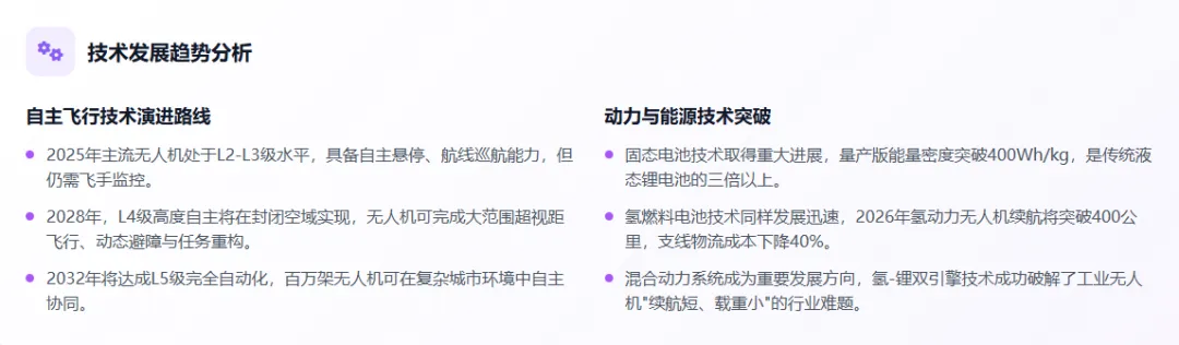 无人机自主飞行技术正参照自动驾驶汽车的 L1-L5 分级标准快速发展。根据行业研究,2025 年主流无人机处于L2-L3 级水平,具备自主悬停、航线巡航能力,但仍需飞手监控。到 2028 年,L4 级高度自主将在封闭空域实现,无人机可完成大范围超视距飞行、动态避障与任务重构,无需人工介入。2032 年将达成L5 级完全自动化,百万架无人机可在复杂城市环境中自主协同,决策延迟降至毫秒级。 中国《"十四五" 民用无人机产业发展规划》明确提出,到 2027 年实现90% 以上行业级无人机具备 L4 级自主飞行能力。美国国防部《2024 年自主系统路线图》同样设定了到 2030 年实现90% 战术无人机具备 L4 级自主飞行能力的目标。以色列创新署发布的《AI + 无人系统国家倡议》计划投入12 亿新谢克尔用于开发抗欺骗导航与跨域协同 AI 架构。 自主飞行技术的核心突破集中在三个方面:一是基于 AI 的感知决策系统,通过深度学习算法实现复杂环境下的自主避障和路径规划;二是多传感器融合技术,整合视觉、激光雷达、毫米波雷达等多种传感器,实现 360 度无死角感知;三是边缘计算能力,将 AI 处理能力集成到无人机端,实现实时决策而无需依赖云端。1.2 动力与能源技术突破