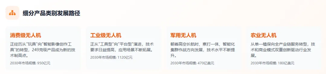 娱乐拍摄是无人机应用的传统优势领域,市场规模持续增长。全球消费级无人机市场规模从 2026 年的63 亿美元预计增长至 2033 年的140 亿美元,年复合增长率为 10.3%。中国消费级无人机市场同样表现强劲,2025 年市场规模达480 亿元,预计 2030 年增至950 亿元,年均复合增长率 14.3%。 技术创新推动产品升级。消费级无人机向轻量化智能化演进,249 克级 IP67 防护产品适配水上运动场景,影像技术升级至8K360° 全景拍摄,配合 AI 自动构图推动影像创作普及。相机模组正向 1 英寸以上传感器、多摄融合及实时 RAW 视频输出方向升级,同时 AI 驱动的智能避障、目标识别与自动剪辑功能成为产品标配,推动用户体验从"能飞"向"会拍、会想"跃迁。 市场格局相对稳定,大疆仍占据68% 的市场份额,其推出的 Mavic Light 2 轻量化机型凭借 45 分钟续航能力巩固高端优势;小米子品牌通过千元级 AI 航拍机切入入门市场,份额提升至15%;极飞试水消费级农业观测机型,开辟细分赛道,丰富了市场供给结构。 应用场景不断拓展。除了传统的航拍创作,无人机在文旅融合、户外运动、家庭教育等领域的应用日益广泛。2026 年春节期间,全国多地正式开通低空物流绿色通道,无人机年货配送、医疗物资运输、应急补给等任务优先保障,快速报备。为保障春节物资畅通,多地对山区、海岛、偏远乡村开通临时低空航线,将常规飞行审批大幅压缩,实现当天申请、当天飞行。 发展趋势呈现多元化特征。未来五年,消费级无人机将加速向智能化、轻量化、绿色化发展,例如集成边缘计算能力实现本地 AI 处理、采用可回收复合材料降低环境影响、引入氢燃料电池或太阳能辅助供电以延长续航。随着 5G、人工智能、物联网等新一代信息技术的深度融合,以及低空经济政策的逐步放开,预计行业将进入高质量发展阶段,市场规模有望在 2030 年达到1200 亿元,五年复合增长率维持在15% 左右。3. 细分产品类别发展路径