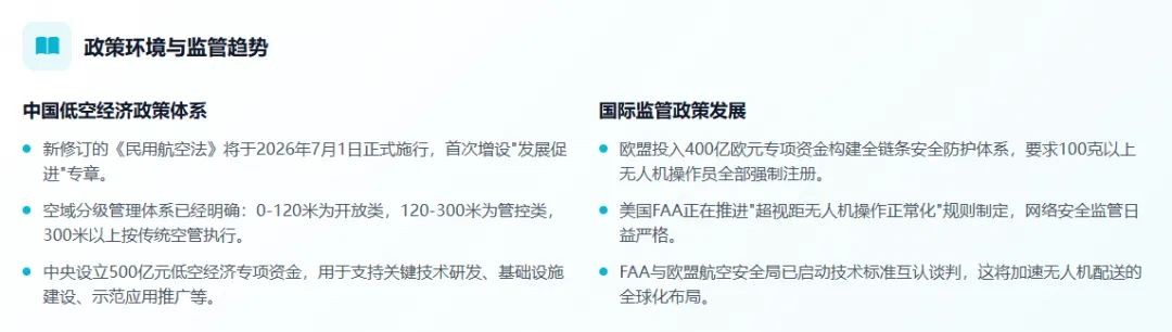 无人机市场快速扩张的同时,也面临诸多市场风险。一是市场竞争日趋激烈,消费级无人机市场呈现“头部集中、中小企业生存困难”的格局,工业级无人机市场同质化竞争加剧,部分企业盲目扩张,导致产能过剩;二是场景落地难度较大,尽管无人机应用场景广泛,但部分场景(如城市物流配送)受空域限制、成本较高、商业模式不成熟等因素影响,规模化落地进展缓慢;三是地缘政治风险凸显,部分国家以“安全为由”设置贸易壁垒,限制无人机产品进口和技术合作,影响中国无人机企业的国际化进程;四是市场需求不确定性增加,受宏观经济环境影响,企业和个人对无人机的采购需求可能出现波动,影响市场增长稳定性。6.3 政策与监管风险