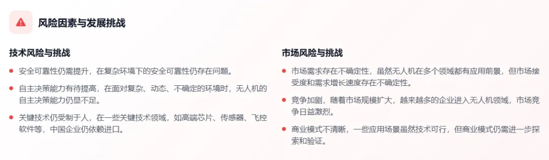 政策与监管环境的变化可能给无人机产业带来不确定性风险。一是监管政策调整风险,各国无人机监管政策仍在不断完善,可能出现监管标准提高、审批流程调整等情况,增加企业合规成本;二是政策落地不及预期,尽管国家层面出台多项扶持政策,但地方层面在政策执行、资源配套等方面可能存在差异,部分政策难以快速落地见效,影响产业发展节奏;三是安全监管压力加大,随着无人机数量增多和应用场景拓展,“黑飞”“乱飞”引发的安全事故风险增加,可能导致监管政策收紧,限制产业发展;四是标准体系不统一,各国无人机标准差异较大,国际标准互认进展缓慢,增加企业国际化运营成本。6.4 产业生态风险