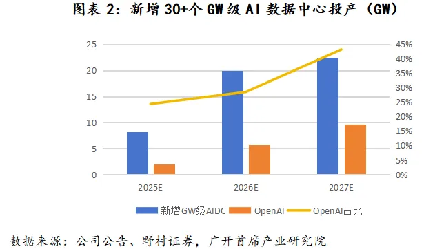 2025-2027年美国AI数据中心潜在投资需求持续强劲。截至目前,自下而上统计各公司公开披露的30多个GW级AIDC数据中心投产时间,统计结果显示,2026-2027年AIDC新增投资需求持续强劲,即AI的潜在投资需求至少在未来两年持续保持增长。从GW级AIDC投资主体构成分析,来自OpenAI的投资占比将从2025年的24%提升至2027年的43%,OpenAI的投资实际落地进度将对整体需求造成较大影响。对美国AIDC投资落地进展影响较大的主要有电力供应等基础设施,下文将着重分析美国AI产业发展面临的这方面瓶颈。