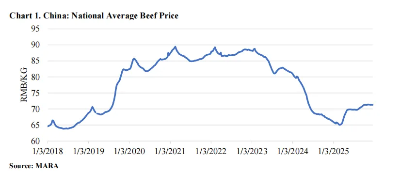 报告中的Chart 1展示了近年来中国全国平均牛肉价格的走势。虽然文本未提供具体逐月数值,但描述了以下关键趋势: