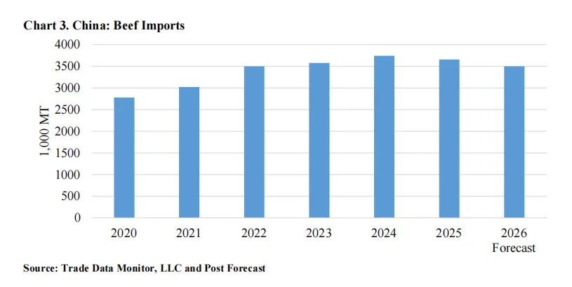 报告大幅下调了2026年中国牛肉进口预测,预计进口量将从2025年的365.8万吨降至350万吨。这一预测的核心变量是保障措施(Safeguard Measures)的实施。