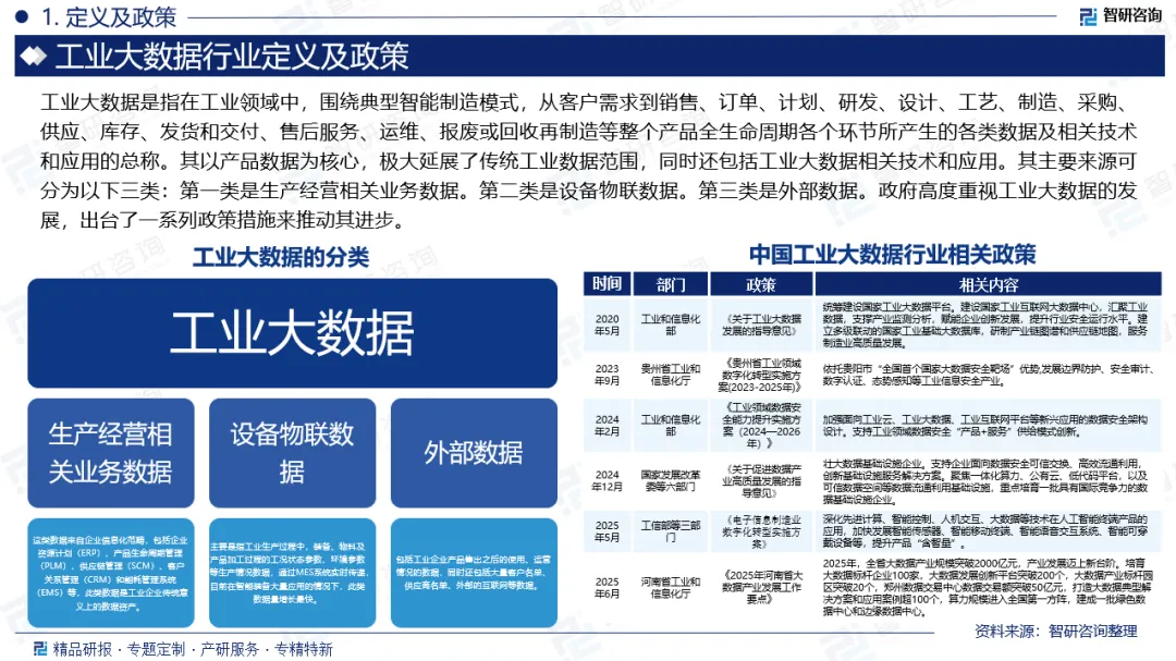 行业政策:政府高度重视工业大数据的发展,出台了一系列政策措施来推动其进步。例如,2025年5月,工信部等三部门印发《电子信息制造业数字化转型实施方案》,深化先进计算、智能控制、人机交互、大数据等技术在人工智能终端产品的应用,加快发展智能传感器、智能移动终端、智能语音交互系统、智能可穿戴设备等,提升产品“含智量”。2025年6月,河南省工业和信息化厅印发《2025年河南省大数据产业发展工作要点》,提出到2025年,全省大数据产业规模突破2000亿元,产业发展迈上新台阶。培育大数据标杆企业100家,大数据发展创新平台突破200个,大数据产业标杆园区突破20个,郑州数据交易中心数据交易额突破50亿元,打造大数据典型解决方案和应用案例超100个,算力规模进入全国第一方阵,建成一批绿色数据中心和边缘数据中心。