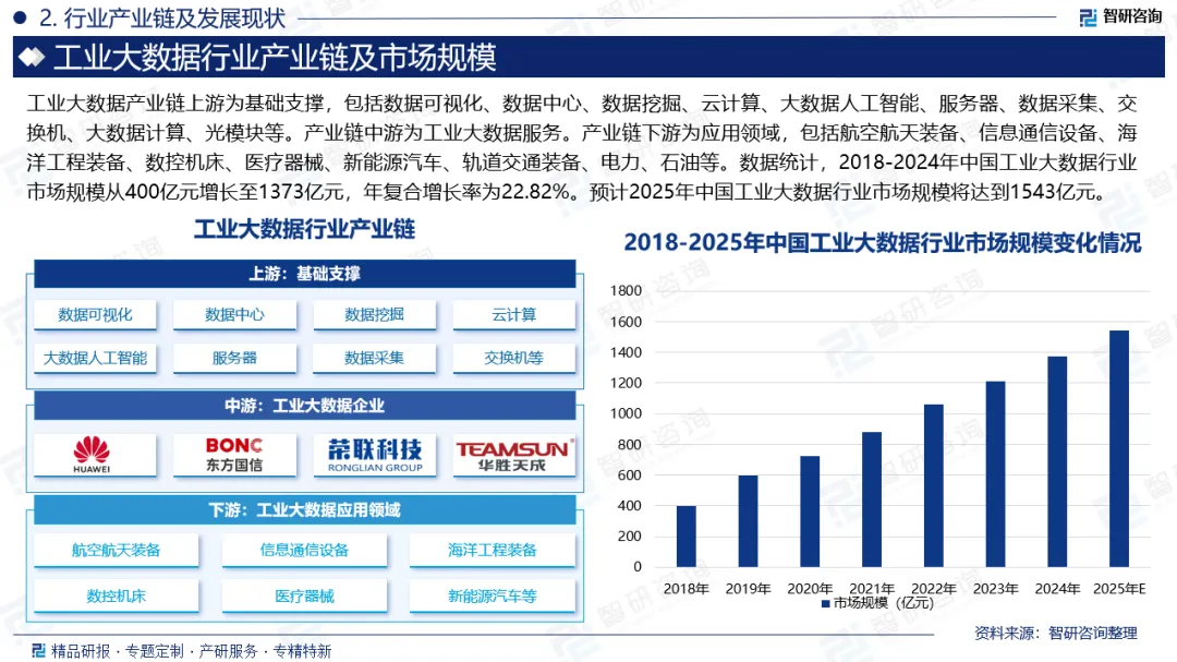 工业大数据是指在工业领域中,围绕典型智能制造模式,从客户需求到销售、订单、计划、研发、设计、工艺、制造、采购、供应、库存、发货和交付、售后服务、运维、报废或回收再制造等整个产品全生命周期各个环节所产生的各类数据及相关技术和应用的总称。其以产品数据为核心,极大延展了传统工业数据范围,同时还包括工业大数据相关技术和应用。其主要来源可分为以下三类:第一类是生产经营相关业务数据。第二类是设备物联数据。第三类是外部数据。近年来,得益于大数据、AI、边缘计算、实时分析、多模态数据整合等技术的快速发展和普及,以及制造业、能源、交通运输等行业对工业大数据需求的不断增加,工业大数据行业市场规模持续扩大。数据统计,2018-2024年中国工业大数据行业市场规模从400亿元增长至1373亿元,年复合增长率为22.82%。未来,我国工业大数据市场规模将持续扩大。一方面,随着制造业数字化转型的深入推进,工业大数据的市场需求将持续增长;另一方面,随着技术创新和融合应用的不断深化,工业大数据的应用场景将不断拓展,市场潜力将进一步释放。预计2025年中国工业大数据行业市场规模将达到1543亿元。中国工业大数据行业已形成内外竞争、层次分明的市场格局。国际巨头如IBM、Oracle、Teradata、EMC易安信、Cisco等凭借其长期积累的数据库、数据仓库技术与完整企业级解决方案,在高端市场占据重要地位,服务于对系统稳定性、全球支持有严苛要求的大型跨国企业与部分国内头部客户。与此同时,以华为、东方国信、荣联科技、华胜天成、海兰信、汉得信息等为代表的国内企业迅速崛起。它们依托对本土工业场景的深刻理解、灵活的产品定制化能力以及持续提升的核心技术,正从项目集成、垂直行业应用等维度切入市场,竞争力不断增强,逐步在关键领域实现国产化替代与市场渗透,构建起自主可控的产业生态。
