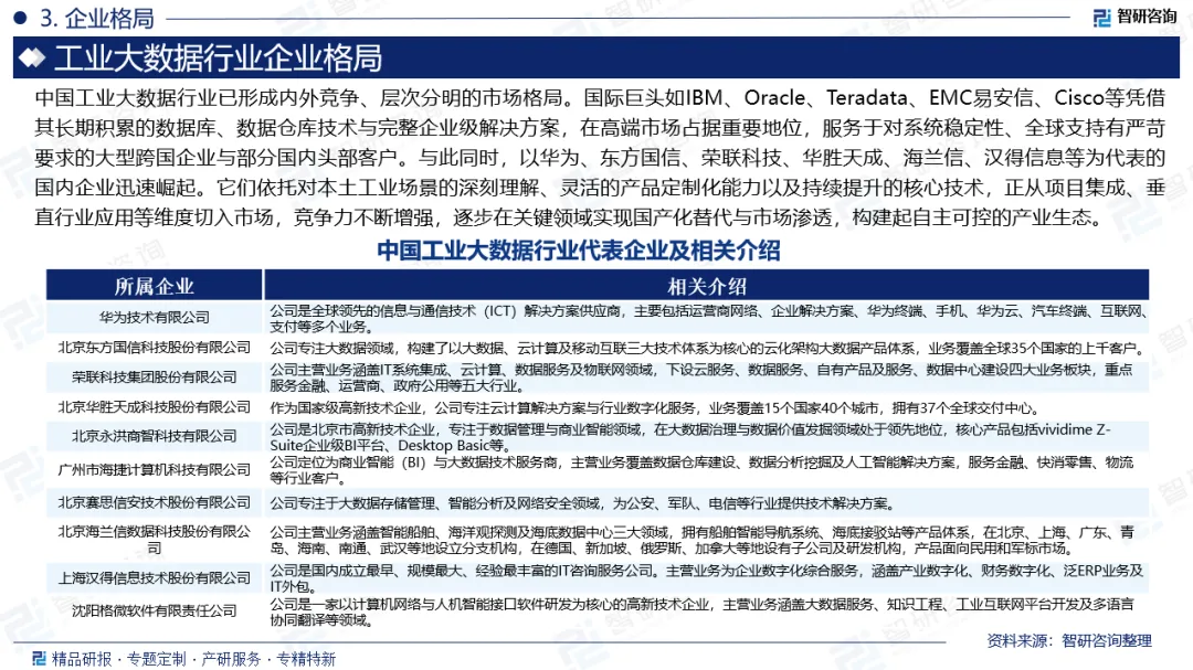 企业格局:中国工业大数据行业已形成内外竞争、层次分明的市场格局。国际巨头如IBM、Oracle、Teradata、EMC易安信、Cisco等凭借其长期积累的数据库、数据仓库技术与完整企业级解决方案,在高端市场占据重要地位,服务于对系统稳定性、全球支持有严苛要求的大型跨国企业与部分国内头部客户。与此同时,以华为、东方国信、荣联科技、华胜天成、海兰信、汉得信息等为代表的国内企业迅速崛起。它们依托对本土工业场景的深刻理解、灵活的产品定制化能力以及持续提升的核心技术,正从项目集成、垂直行业应用等维度切入市场,竞争力不断增强,逐步在关键领域实现国产化替代与市场渗透,构建起自主可控的产业生态。