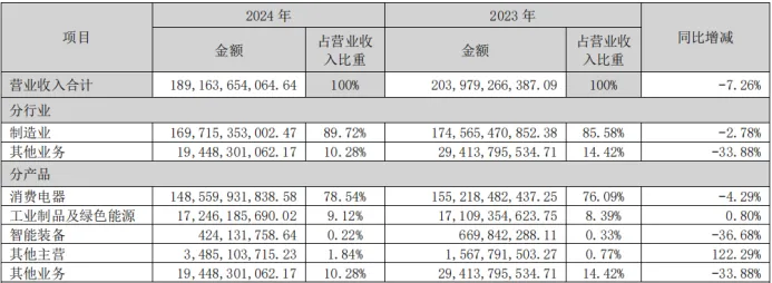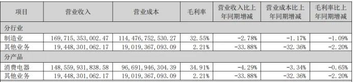 从格力的财报中也能看出,产品分为了消费电器、工业制品及绿色能源、智能装备、其他主营、其他业务,这里的其他主营和其他业务我觉得就很多余,从下表也能看出,格力的其他业务毛利率极低,仅2.21%。