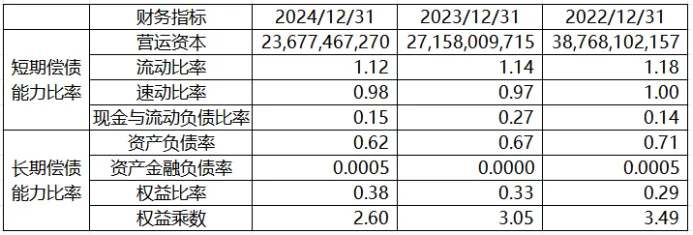 从短期偿债能力看,营运资本从2022年的387.68亿元,降至2023年的271.58亿元,再到2024年的236.77亿元,连续三年大幅下降。表明公司可用于偿还流动负债的净营运资本持续减少,短期流动性储备有所收紧。