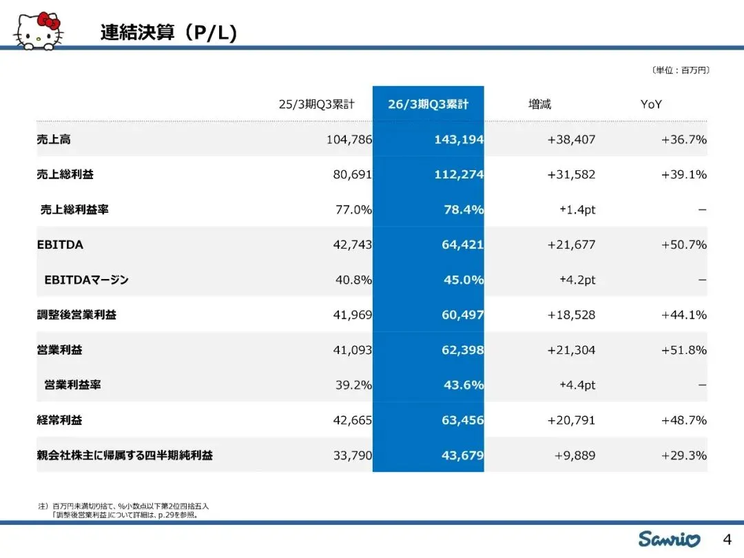 如果可爱有重量,三丽鸥刚刚交出了史上最沉甸甸的一份成绩单。2026年2月,三丽鸥公布了其2026财年第三季度财报。数据显示,年累计销售额达到1431亿日元,约合人民币69亿元,同比增长36.7%;营业利润623亿日元,同比增长51.8%。无论是累计还是单季,均刷新了历史纪录。
