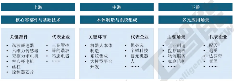 中游聚焦机器人本体制造、系统集成和大模型平台开发,优必选、宇树科技、智元机器人等企业在本体制造和系统集成领域表现突出。