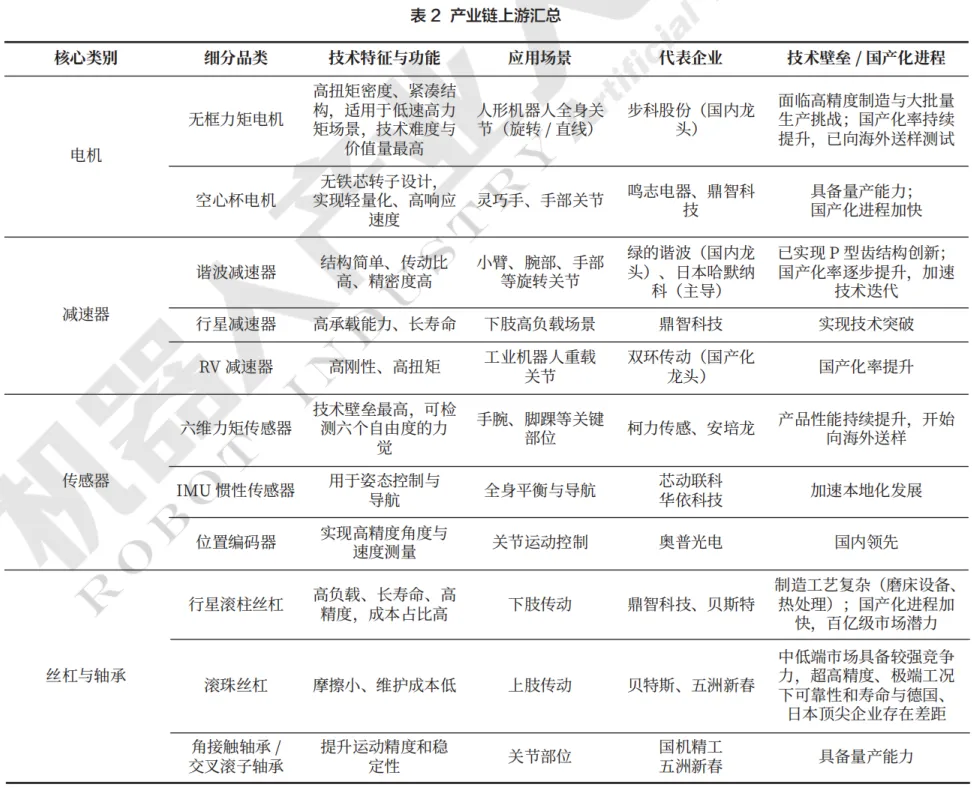 上游环节包括谐波减速器、六维力传感器、无框力矩电机、空心杯电机、丝杠、控制器、芯片等关键部件及基础算法研发,代表企业有三花智控、绿的谐波、鸣志电器等。
