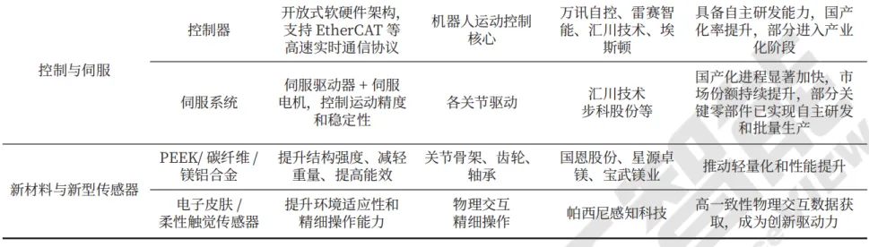 具身智能产业链上游已形成涵盖电机、减速器、传感器、丝杠轴承、控制伺服,以及新材料等的技术体系,国内企业在无框力矩电机、谐波减速器、六维力传感器等高壁垒环节实现显著突破,国产化进程加速,核心零部件自主可控能力持续增强,为产业规模化发展奠定了坚实基础。
