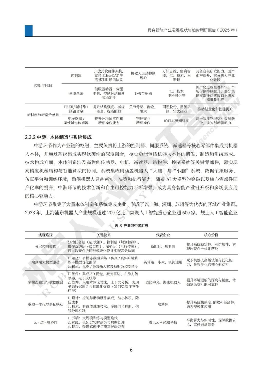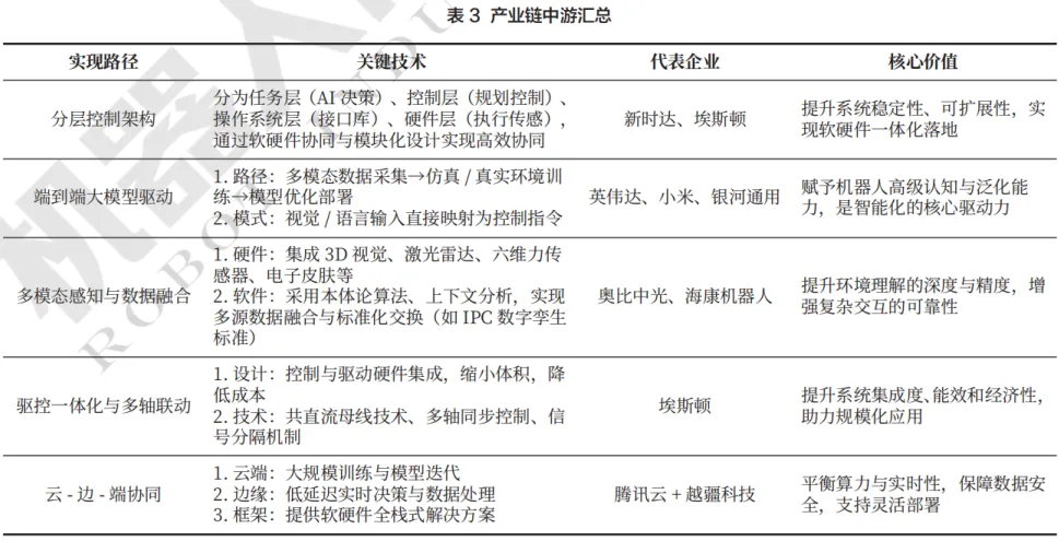 中游环节聚集了大量本体制造和系统集成企业,形成了以上海、深圳、苏州等为代表的区域产业集群。2023 年,上海浦东机器人产业规模超过 200 亿元,集聚人工智能重点企业超 600 家,规上人工智能企业产业规模超 1400 亿元。2023 年,深圳机器人产业链总产值达 1797 亿元,企业数量近 6 万家,产业链完整,涵盖本体制造、系统集成和零部件配套;苏州吴中区 "机器人 + 智能制造" 企业超千家,2023 年产业规模达 1369.3 亿元,全国六成以上的服务机器人产自吴中区,全国七分之一的内资品牌工业机器人来自吴中区。本体制造和系统集成的主流技术路径包括分层决策模型、大模型驱动端到端集成、多模态感知融合,以及云边端协同架构等。