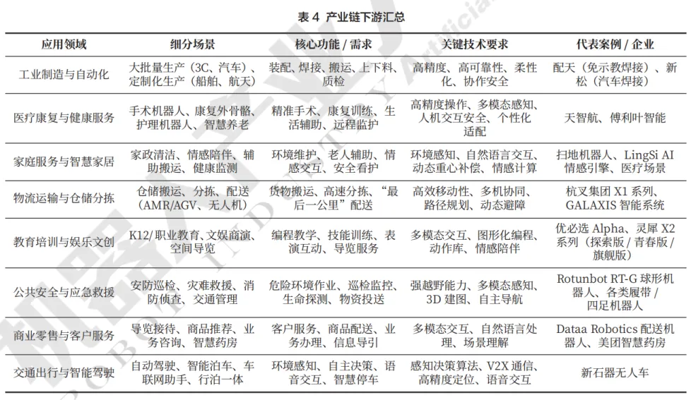 具身智能产业链下游应用场景广泛,涵盖工业制造、医疗康复、家庭服务、物流运输、教育娱乐、公共安全、智慧养老与智慧医疗、商业零售、交通出行等细分领域。各场景推动多机器人协作和跨模态融合,实现具身智能产品的多样化落地与规模化应用。