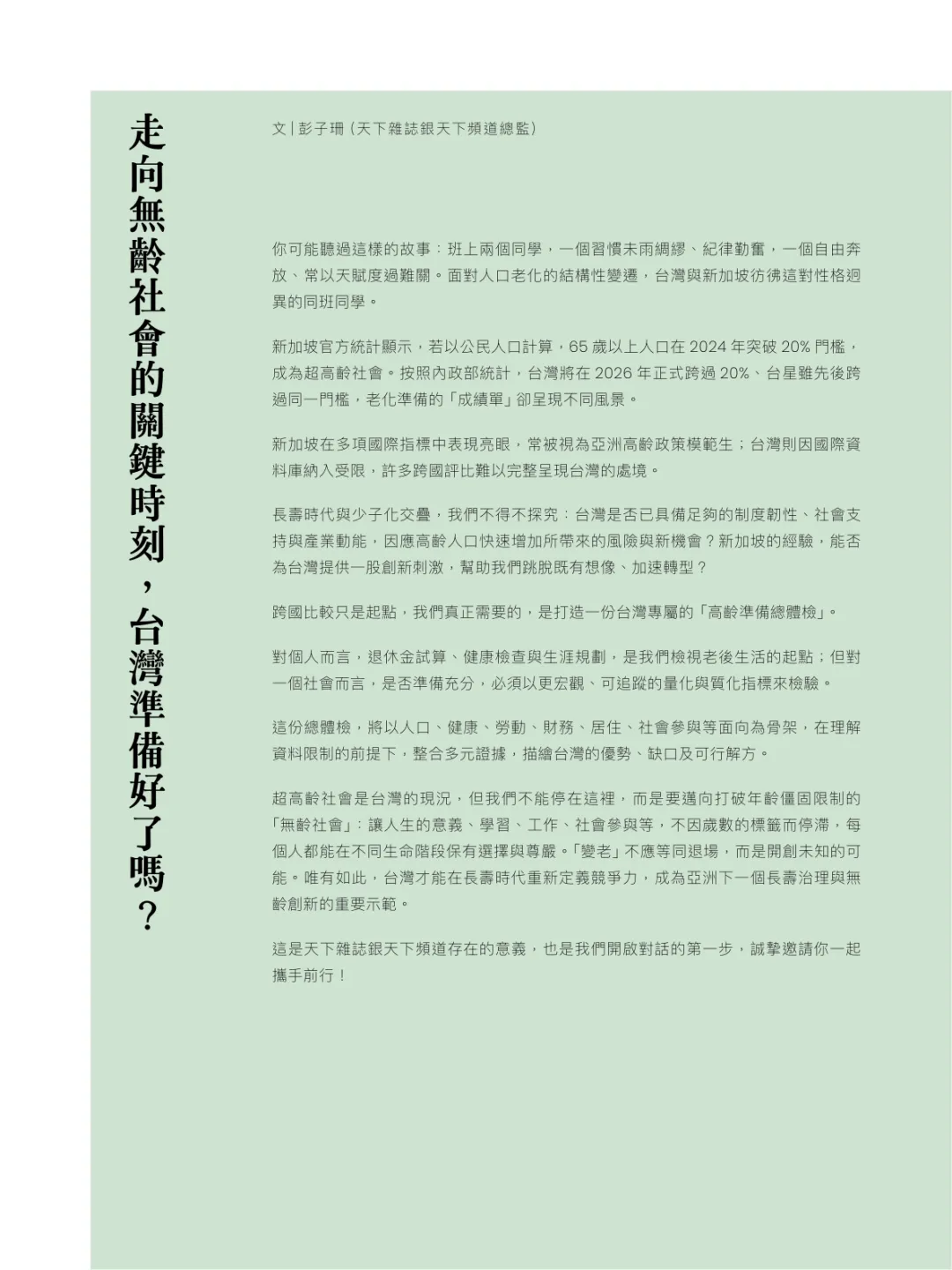 2026无龄社会白皮书:超高龄时代的转型与突围!《2026无龄社会白皮书》由天下杂志与星展基金会联合推动,系统梳理台湾超高龄社会现状、核心挑战、国际经验与行动路径,聚焦健康、财务、劳动、社会参与等关键维度,为台湾迈向无龄社会提供全景式参考。