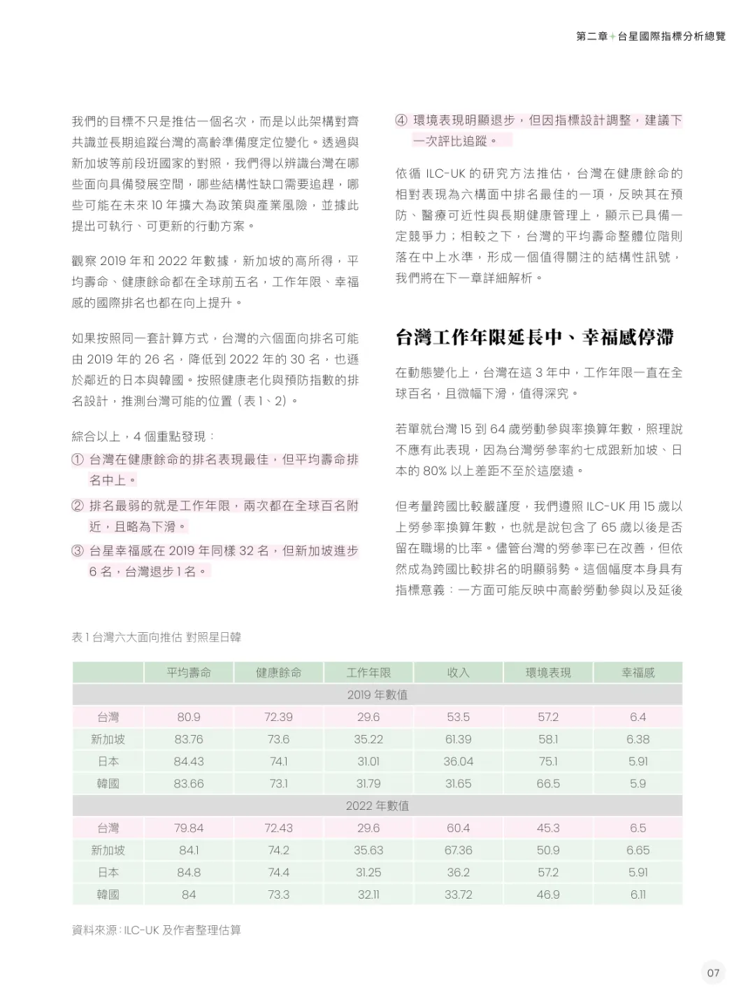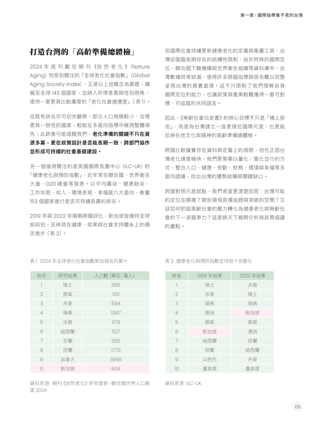 国际排名差距:台湾在ILC-UK健康老化与预防指数中排名第30名,逊于新加坡(第4名)、日本(第20名)、韩国(第24名);优势集中在健康余命(第9名),劣势为工作年限(第102名)、环境表现(第59名)。 新加坡核心优势:通过中央公积金(CPF)强制储蓄制度覆盖购屋、医疗、退休需求;政策整合健康、学习、居住、就业等多维度,活躍老化中心超200间,微型就业模式促进社会参与,减少孤立风险。 台湾独特挑战:国际数据缺漏导致难以完整参与跨国评比;女性劳动参与率提升阻力大;退休保障三支柱(劳保、劳退、个人储蓄)存在结构失衡,劳保预计2031年面临财务危机。