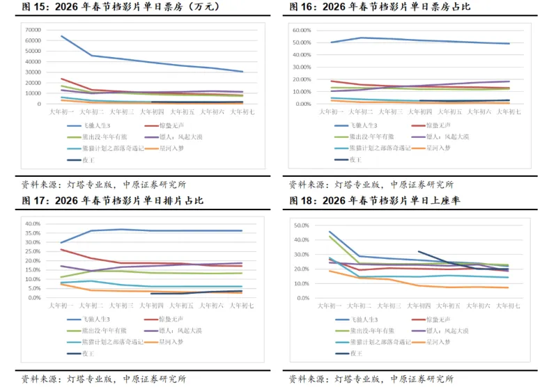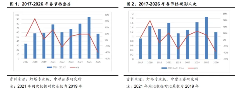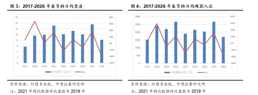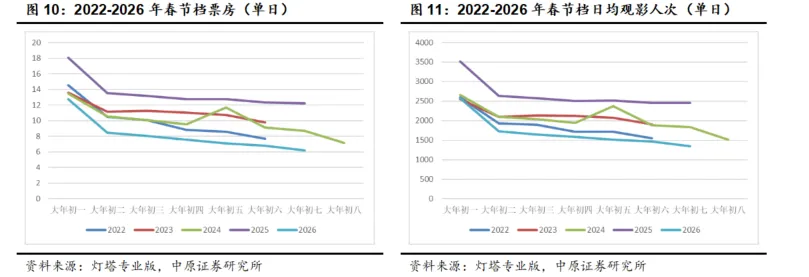 2026年春节档多项数据不仅比2025年有比较大幅度的回落,也处于2018年以来同档期较低位置,表现明显弱于市场预期。虽然整体的平均票价有所下降,但通过降价方式对于观影人次的拉动较为有限,原因在于:(1)2025年春节档在现象级破圈爆款影片《哪吒2》带动下各项数据创新高,存在基数压力;(2)2026年春节假期达到9天,居民出游需求增加,对观影需求造成分流或延后,结合国家移民管理局和文旅部数据,2026年春节假期全国出人次5.96亿,同比增加0.95亿,日均出入境197.7万人次,同比增加10.1%;(3)影片内容题材与档期需求存在偏差,部分严肃题材类型影片与假期氛围存在差异,如果无法实现有效的口碑发酵和圈层突破则难以带动观影需求;(4)短剧、漫剧以及短视频、游戏等免费或低体验成本的娱乐方式对高体验成本的电影领域形成分流。