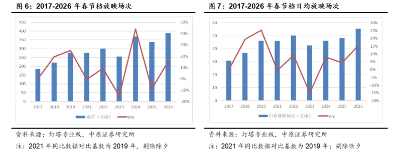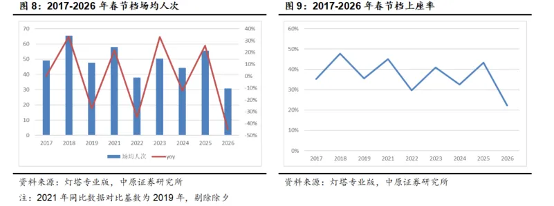 放映场次新高,但上座率下滑严重。2026年春节假期累计放映电影388.0万场,同比增加15.24%,日均放映场次55.43万场,同比增加15.24%,达到历年最高水平。但以观影人次和放映场次计算,测算2026年春节档场均人次30.67人,同比减少44.78%,降幅高于观影人次下降幅度,导致影院的上座率下滑更加显著,从2025年的43.3%下降至22.2%。